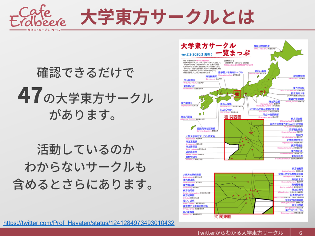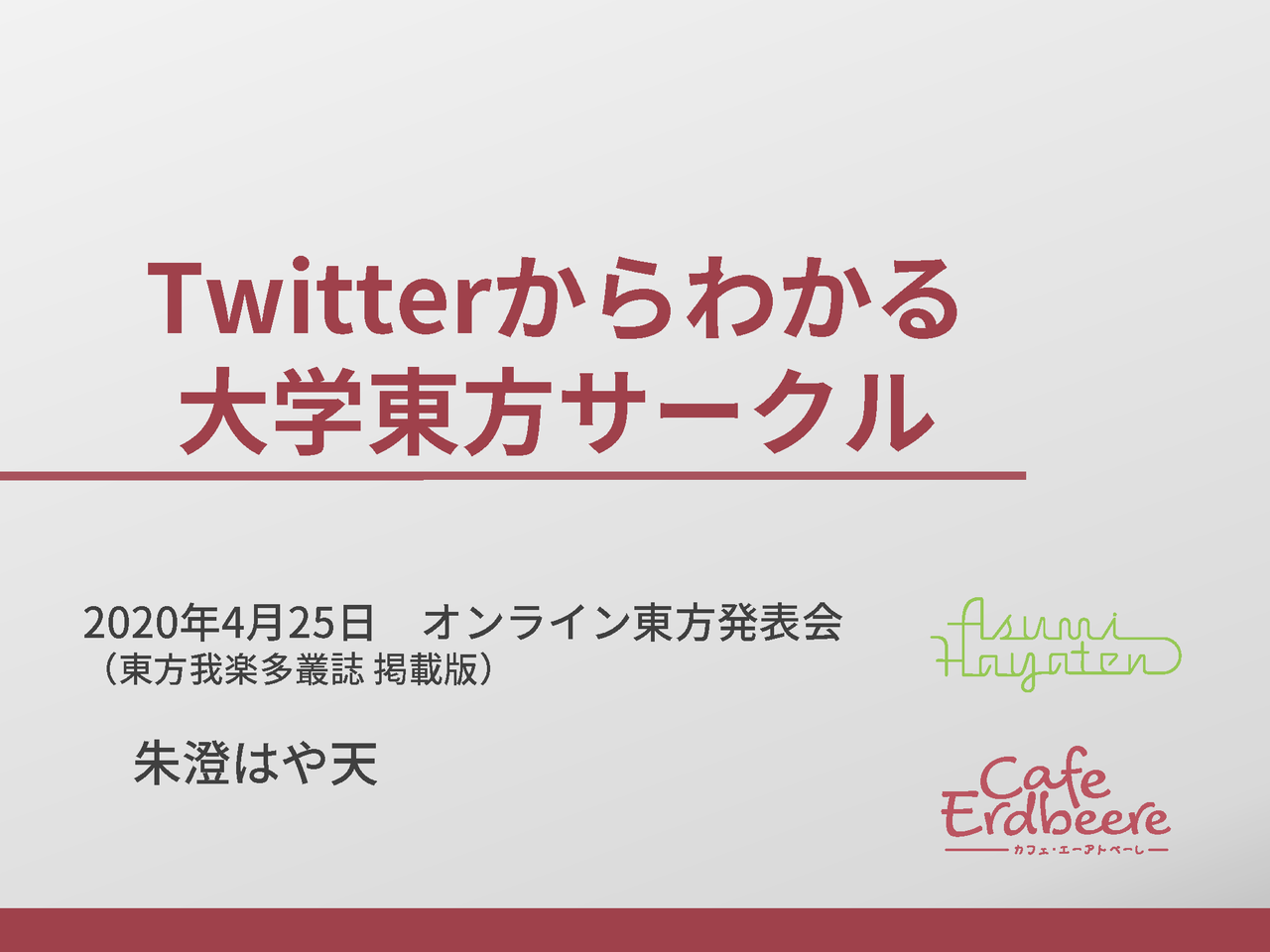 今回掲載するのは、朱澄はや天(Asumi Hayaten)さんの「Twitterから分かる大学東方サークル」です。