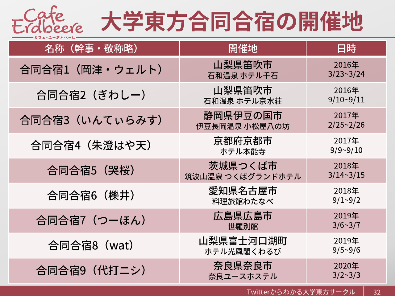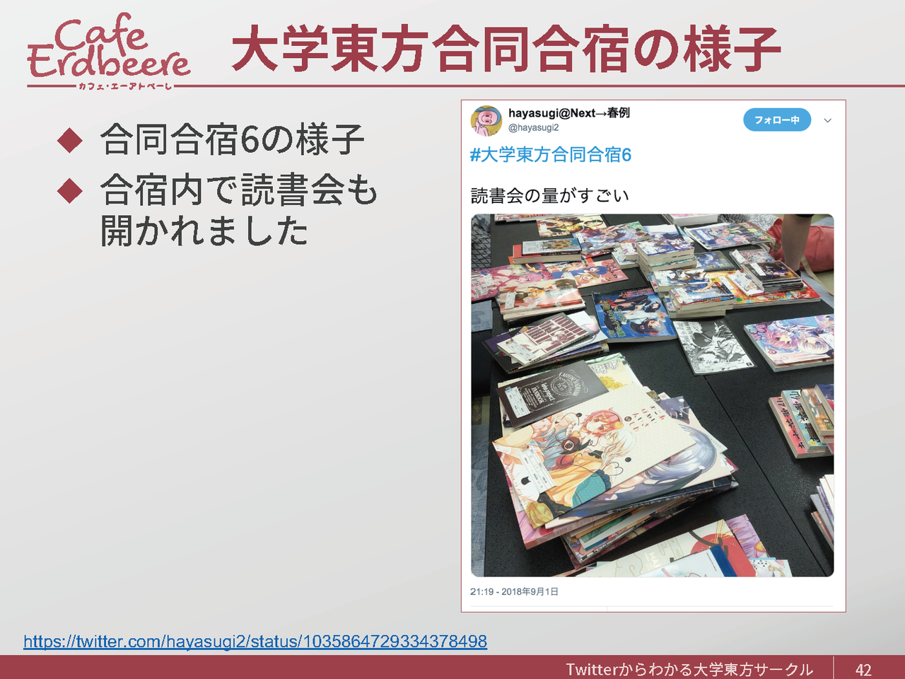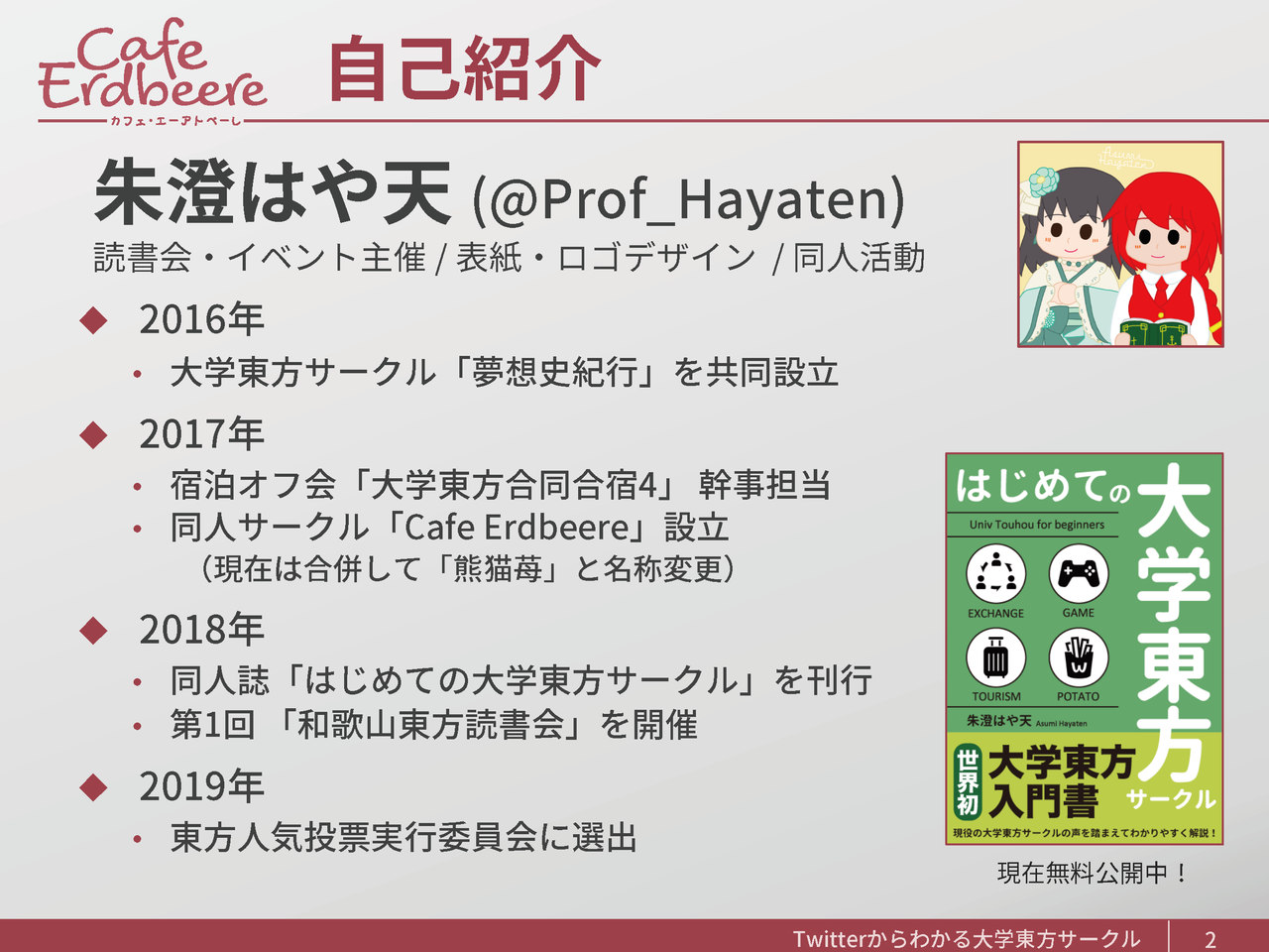 今回のスライドで「大学東方サークルについてもっと詳しく知りたい」「大学東方サークルを作って運営してみたい」という方がおられましたら、著書「はじめての大学東方サークル」を読んでいただければと思います!(現在は無料公開中です https://cafe-erdbeere.booth.pm/items/1363935 )