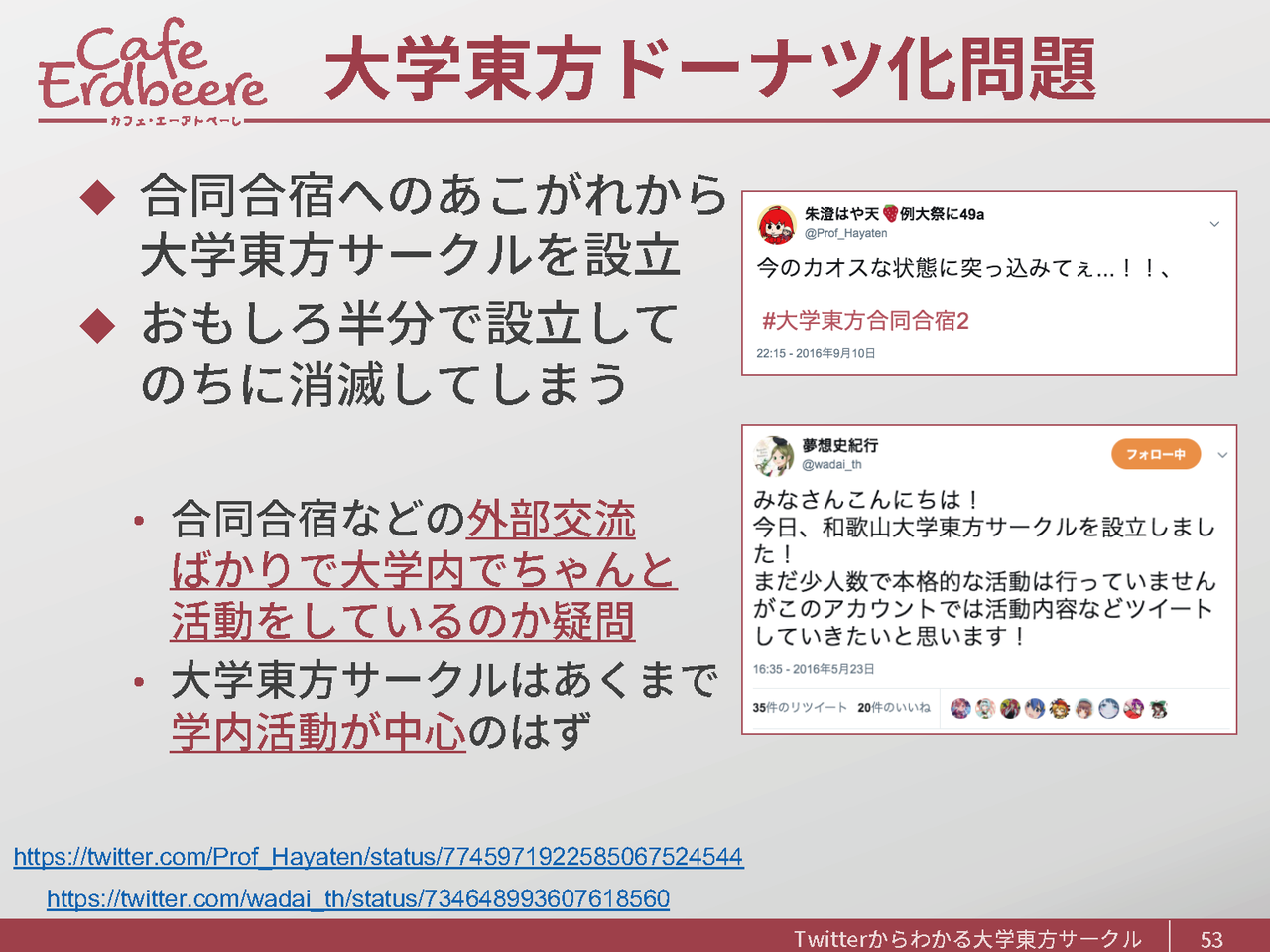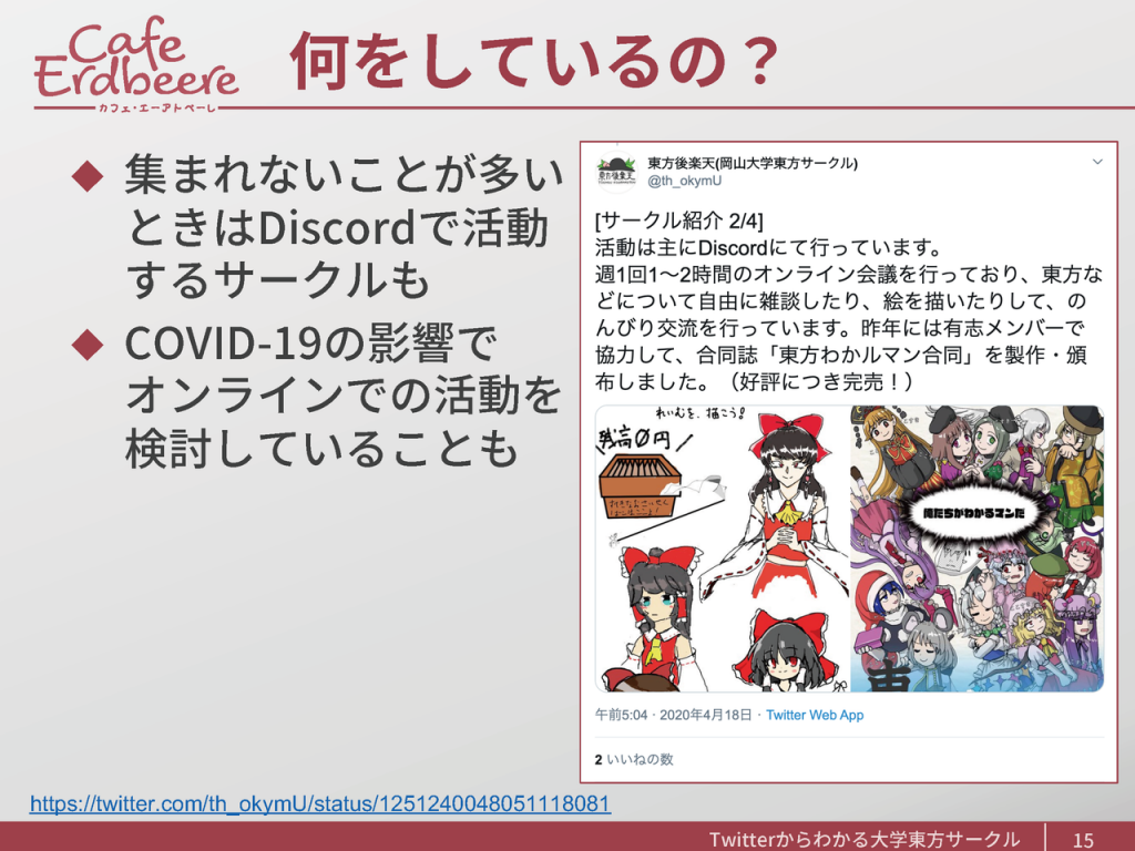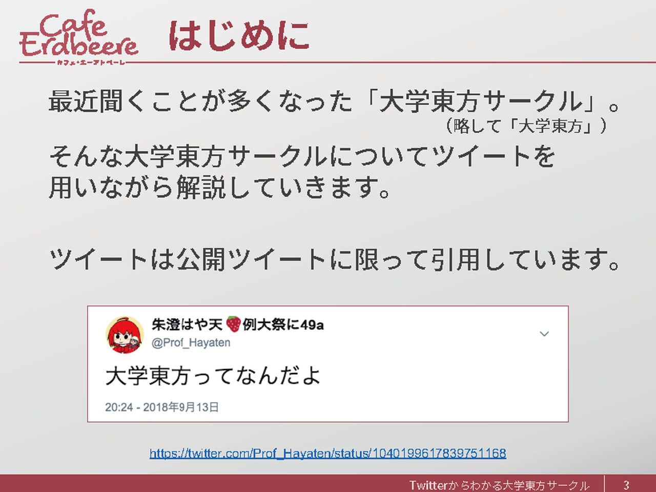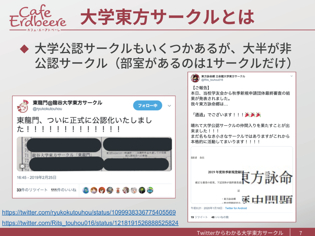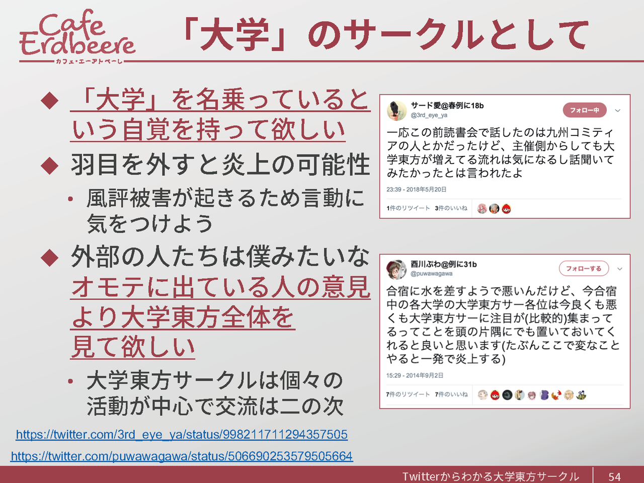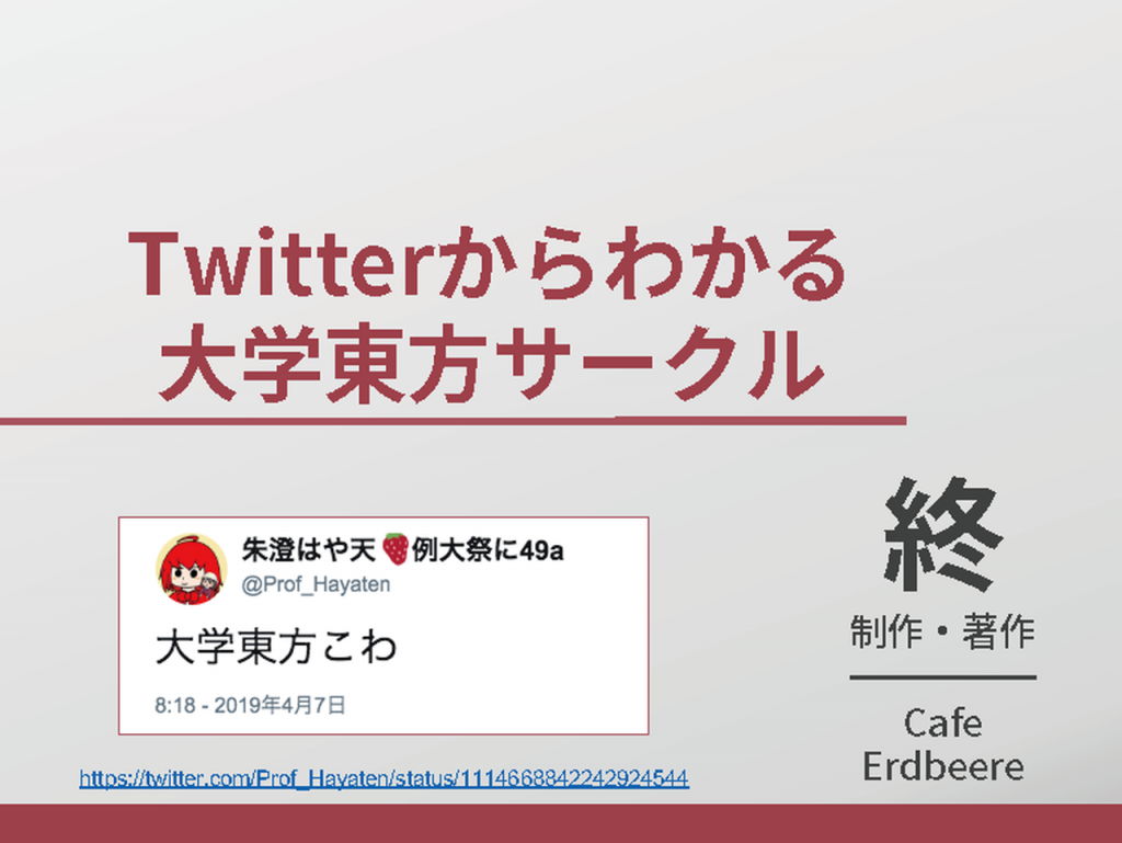 今回はTwitterのツイートを用いて「大学東方サークル」の活動や実態について発表したスライドを掲載させていただきました。引用させていただいたツイートは、各スライドにURLを掲載しておりますので、そちらからご覧ください。