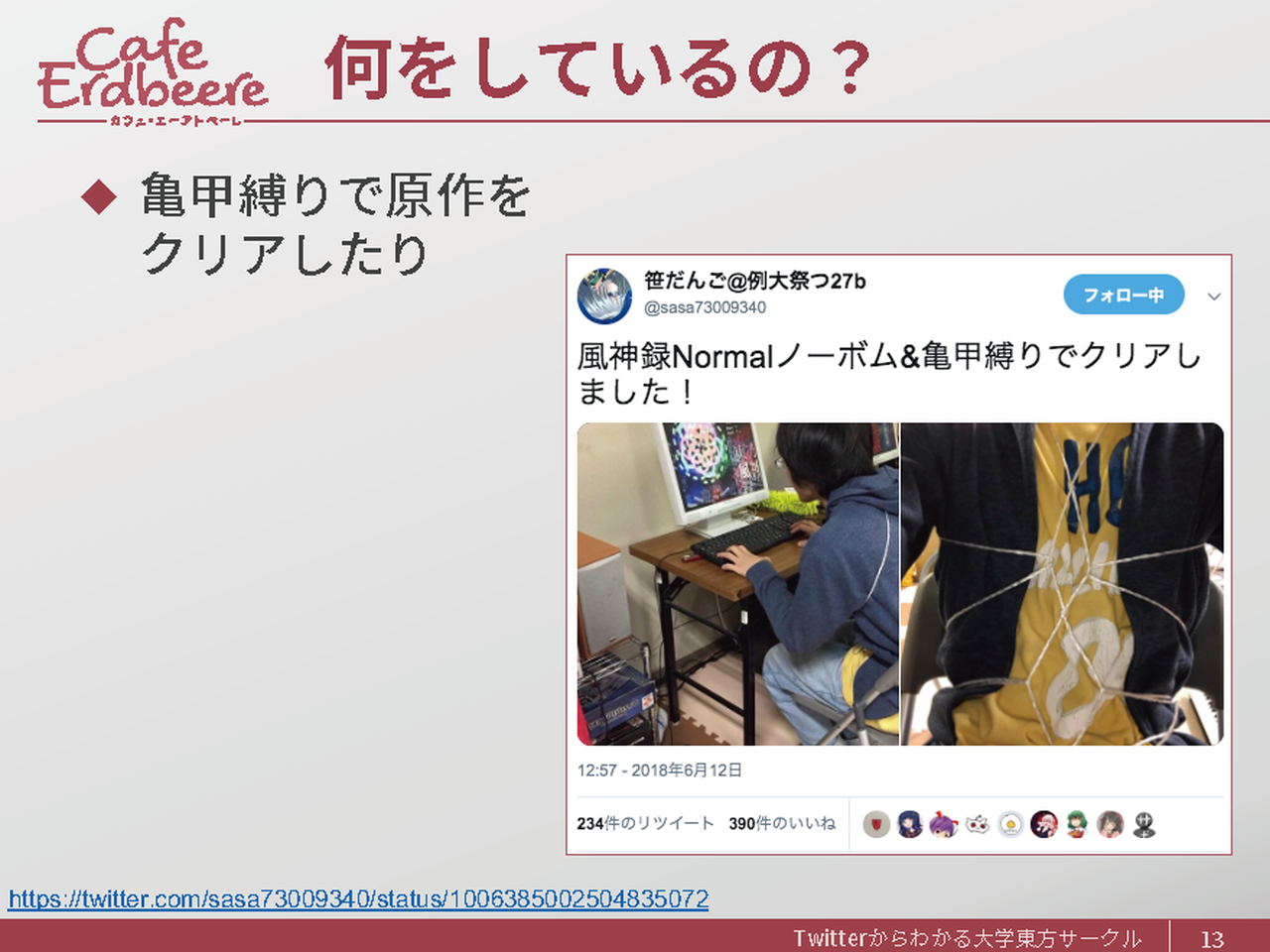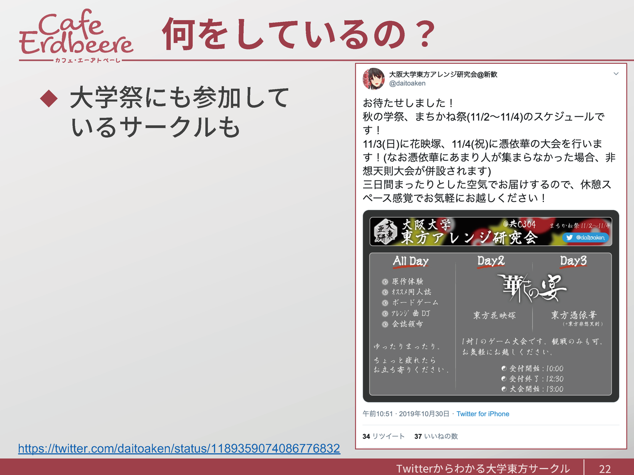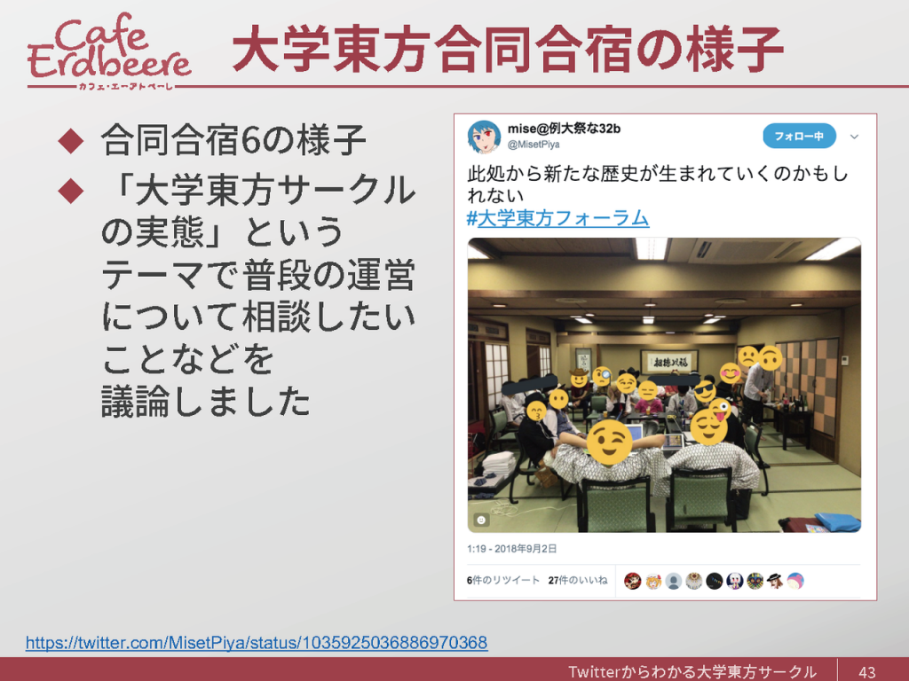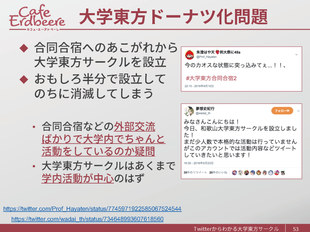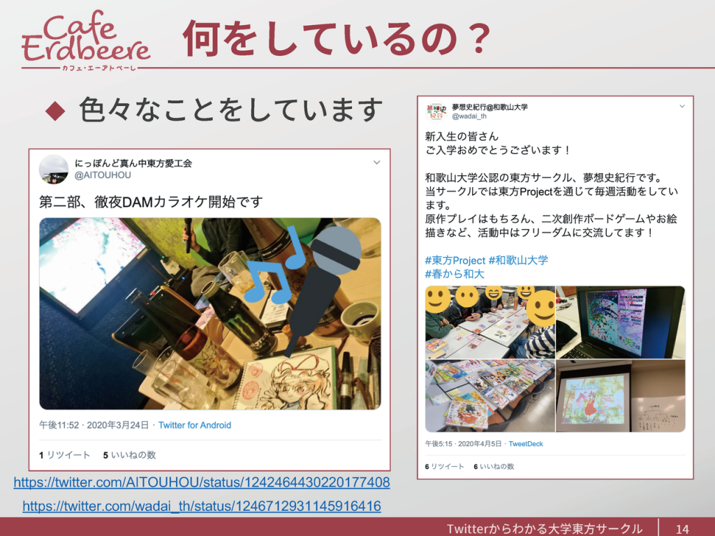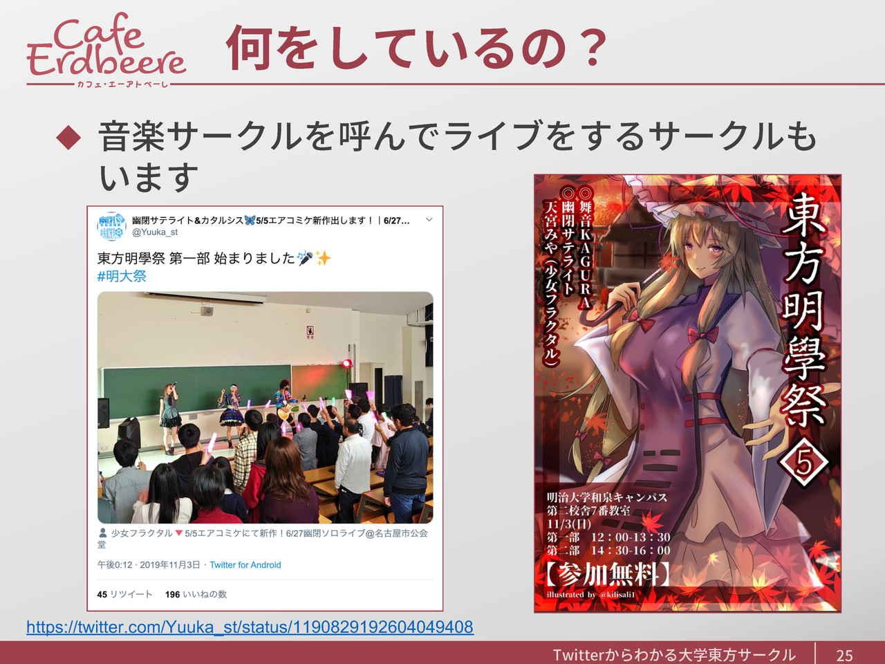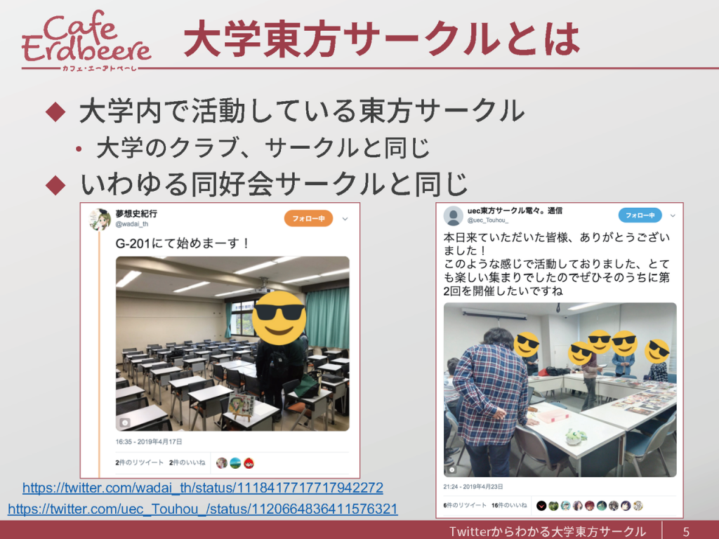 今回はTwitterのツイートを用いて「大学東方サークル」の活動や実態について発表したスライドを掲載させていただきました。引用させていただいたツイートは、各スライドにURLを掲載しておりますので、そちらからご覧ください。