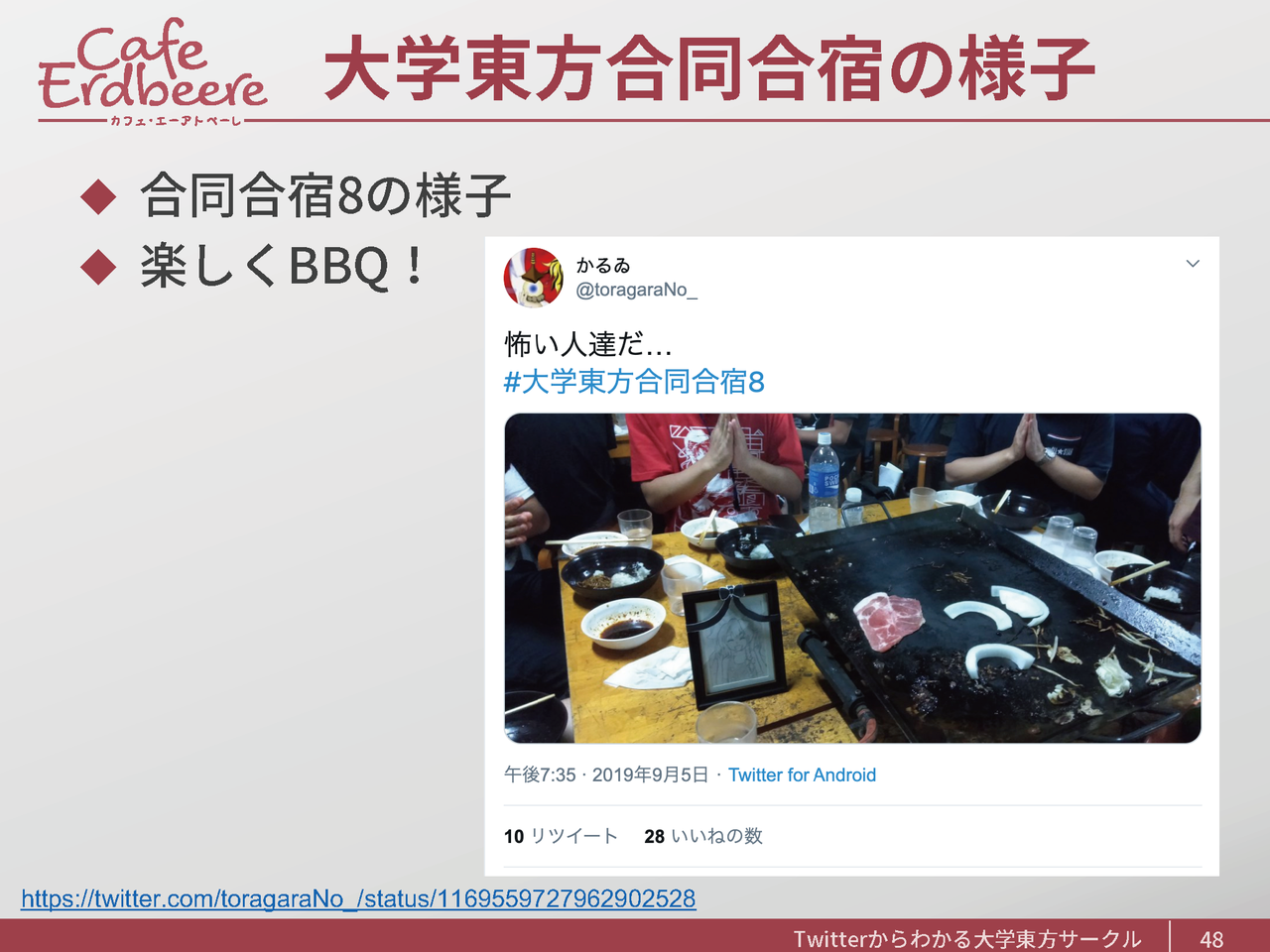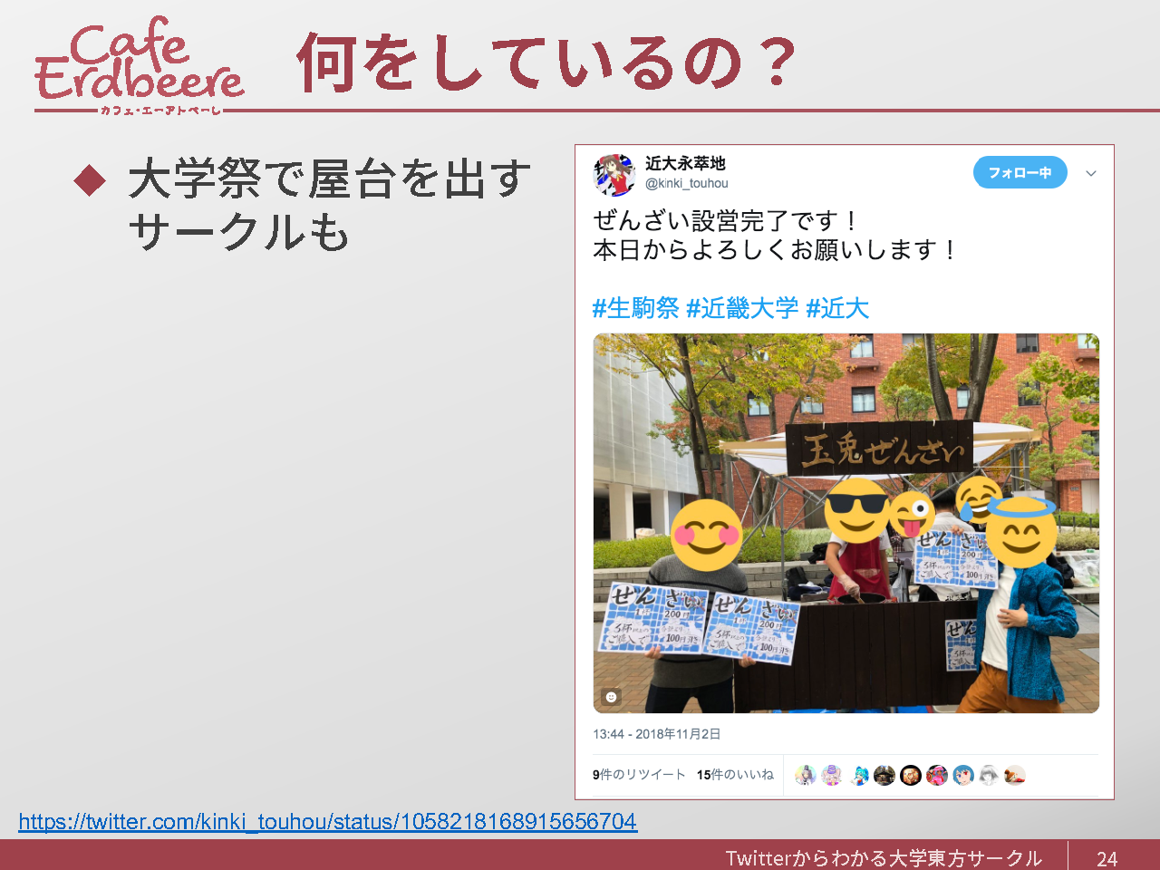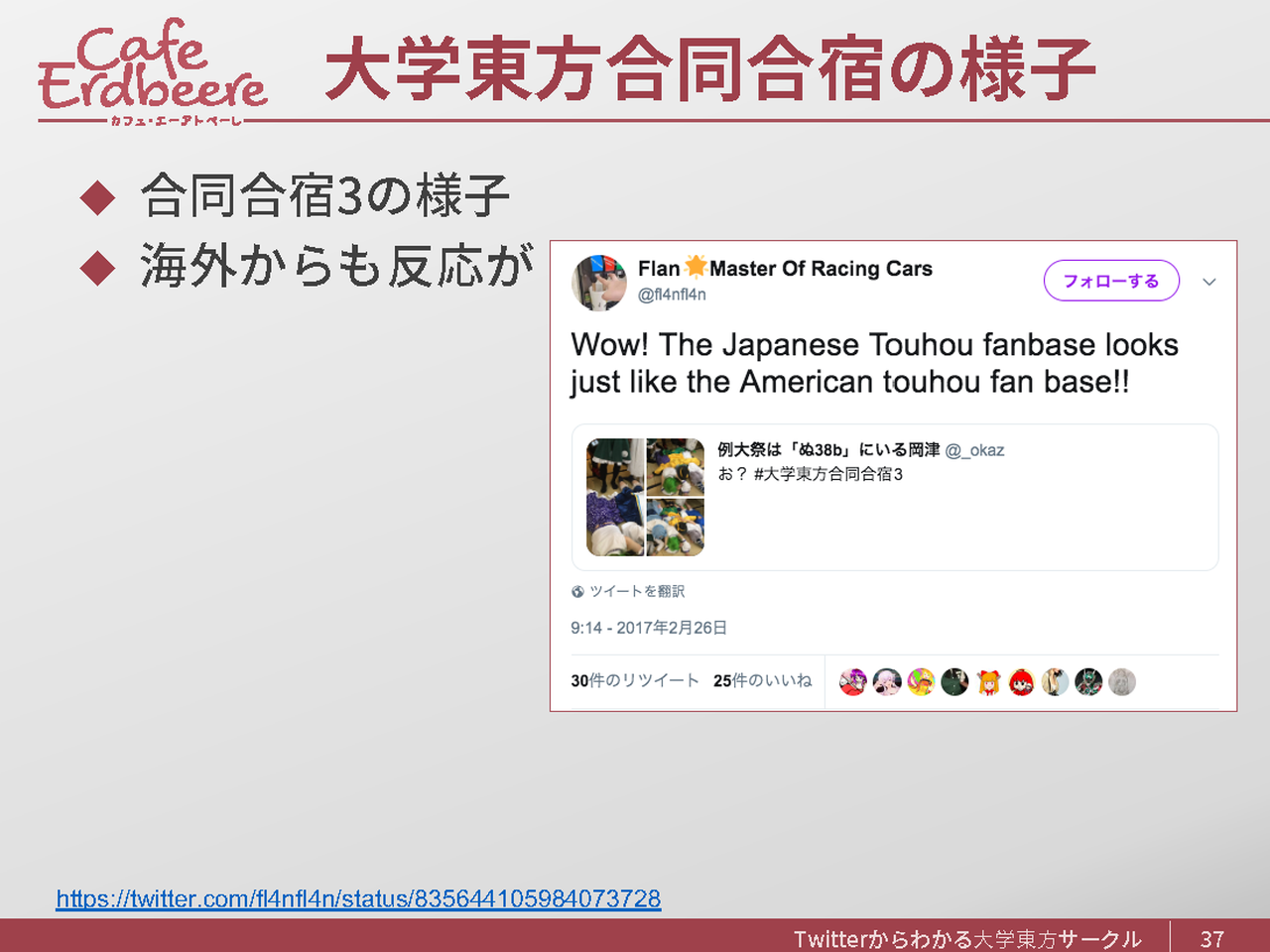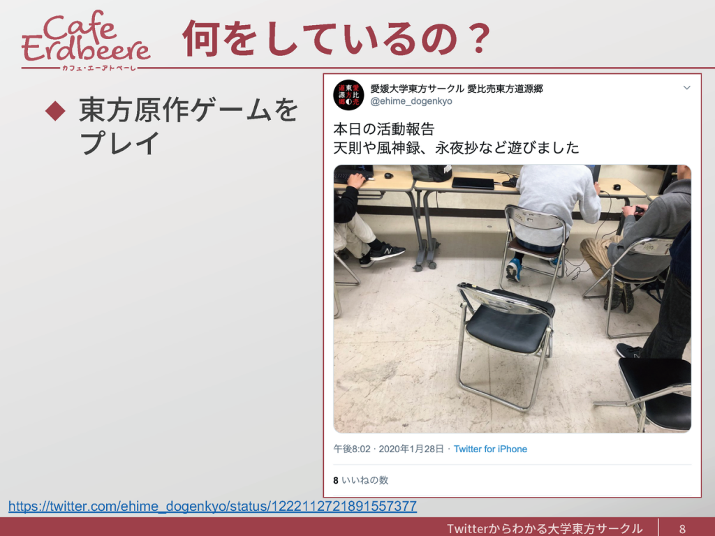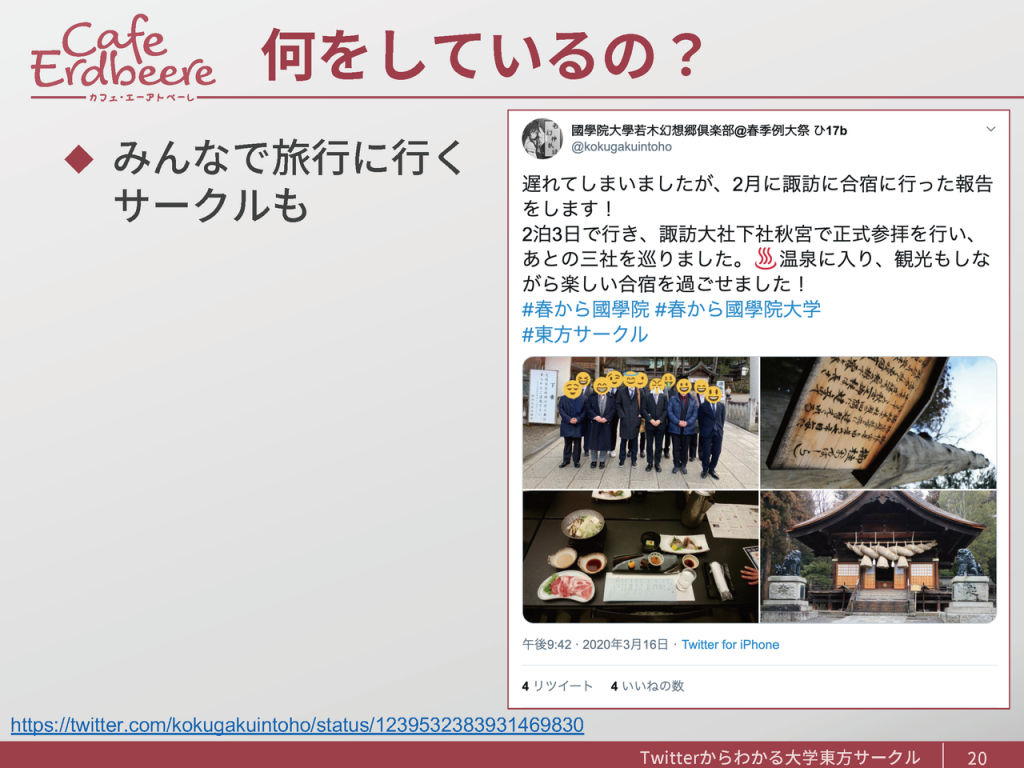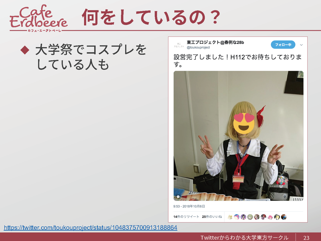 今回はTwitterのツイートを用いて「大学東方サークル」の活動や実態について発表したスライドを掲載させていただきました。引用させていただいたツイートは、各スライドにURLを掲載しておりますので、そちらからご覧ください。