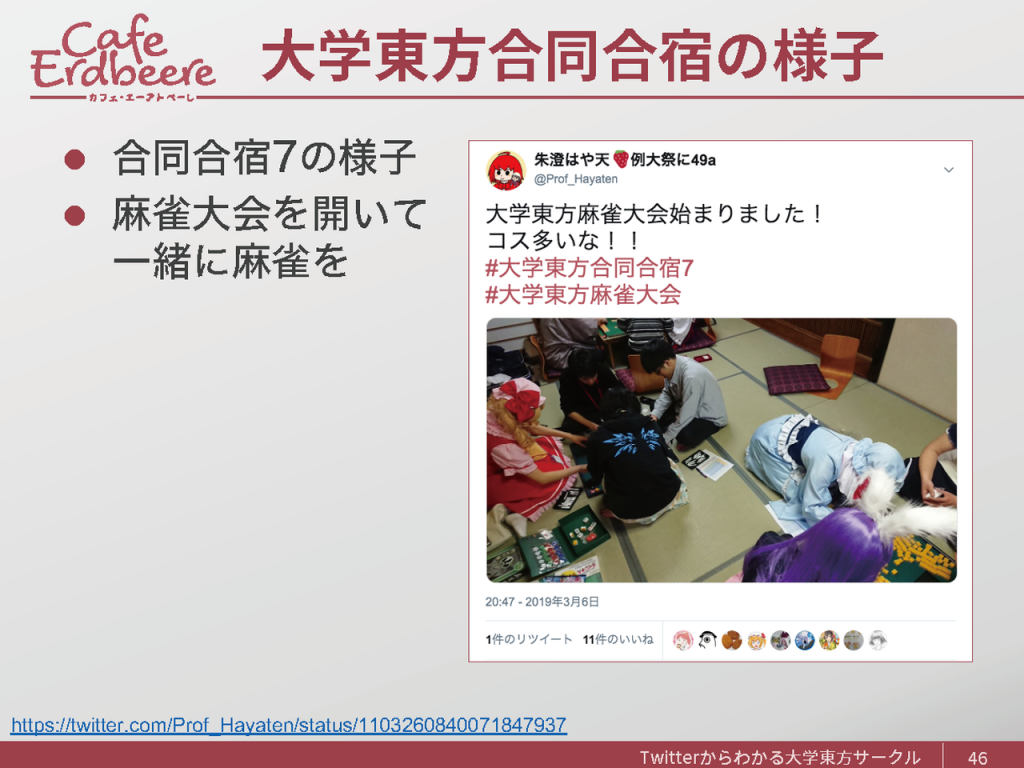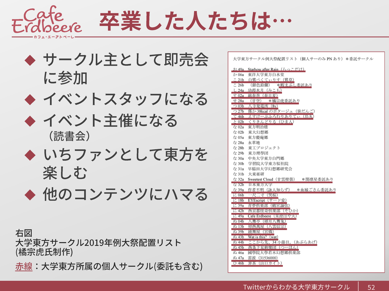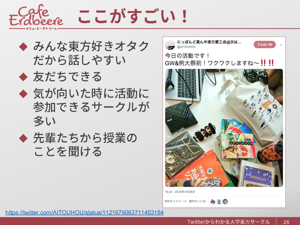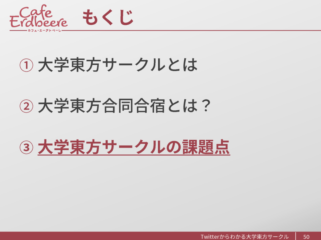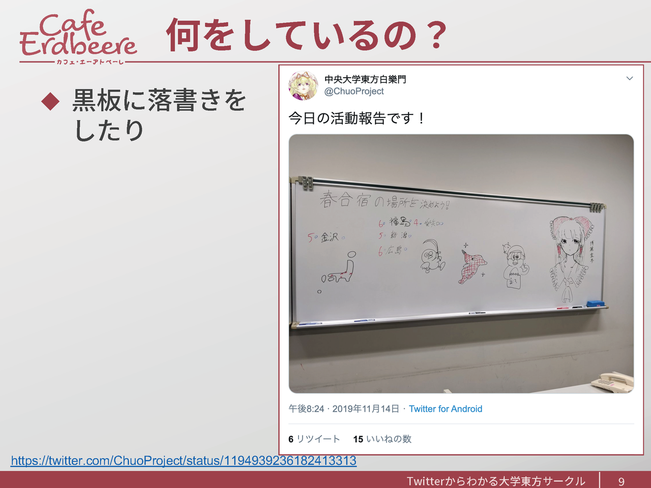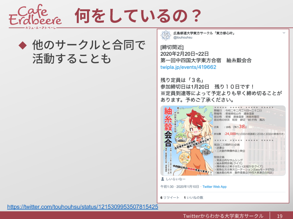 今回はTwitterのツイートを用いて「大学東方サークル」の活動や実態について発表したスライドを掲載させていただきました。引用させていただいたツイートは、各スライドにURLを掲載しておりますので、そちらからご覧ください。