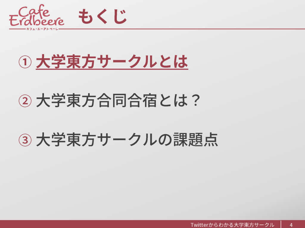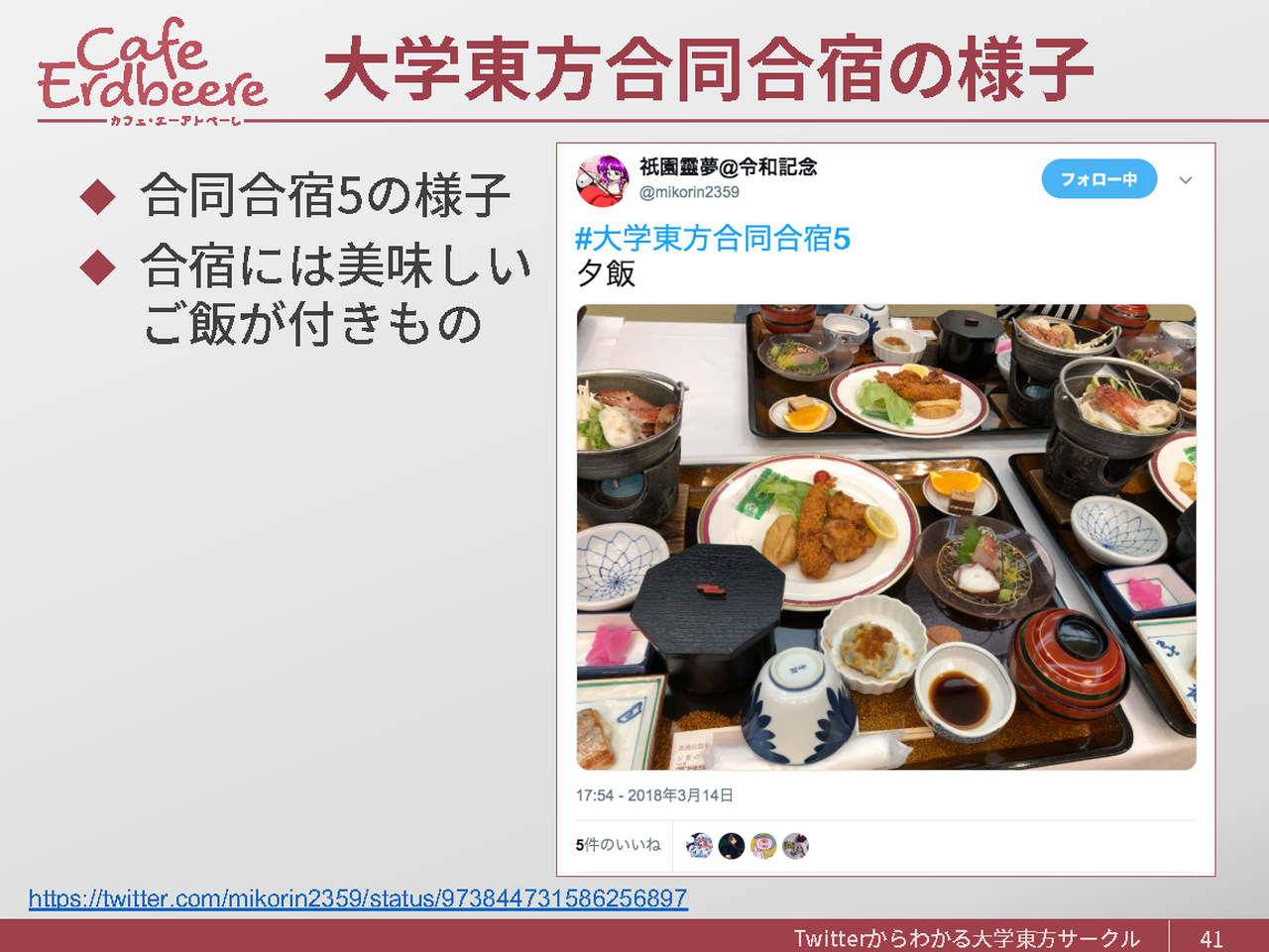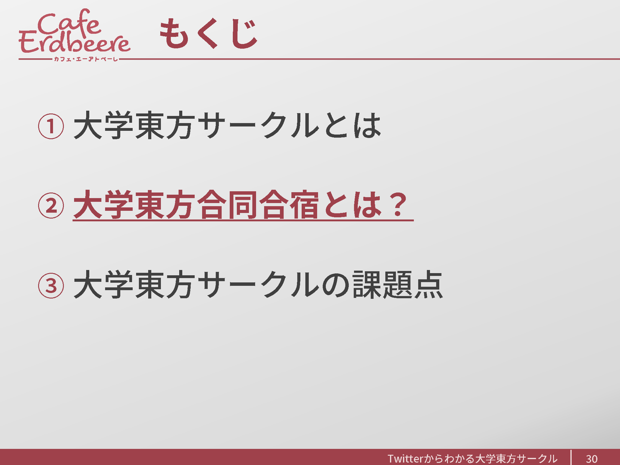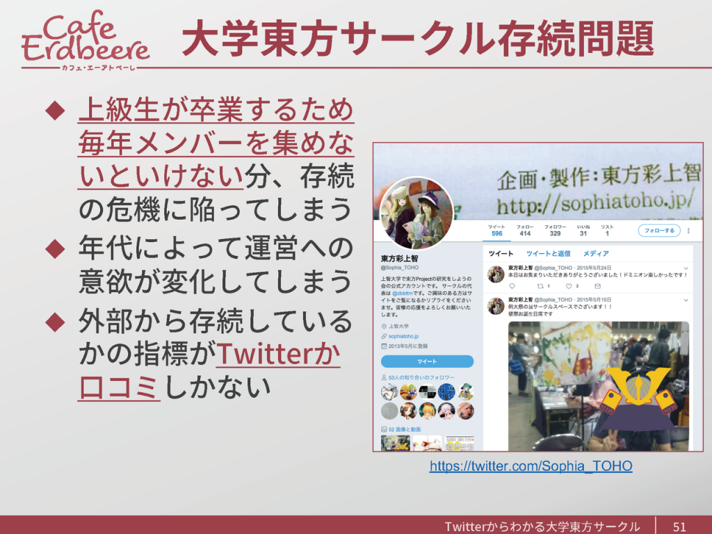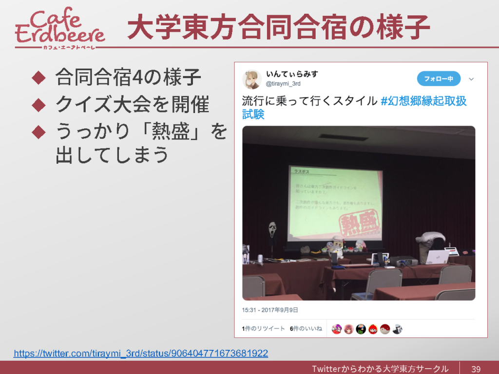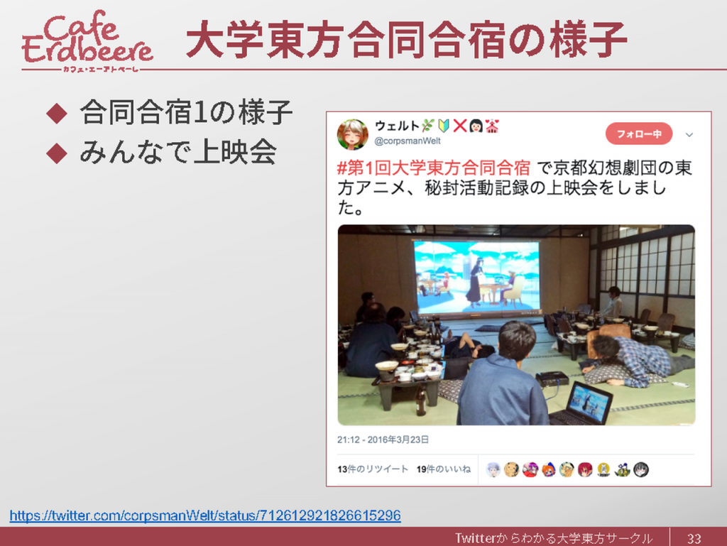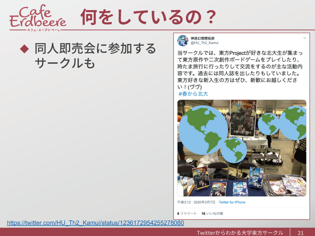 今回はTwitterのツイートを用いて「大学東方サークル」の活動や実態について発表したスライドを掲載させていただきました。引用させていただいたツイートは、各スライドにURLを掲載しておりますので、そちらからご覧ください。