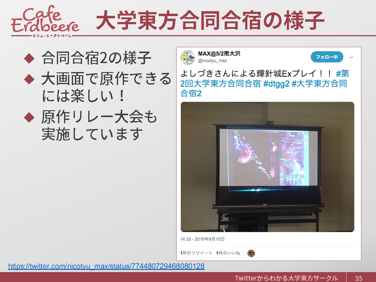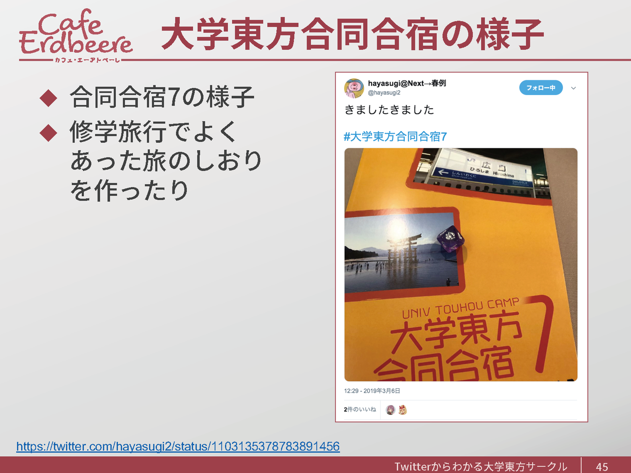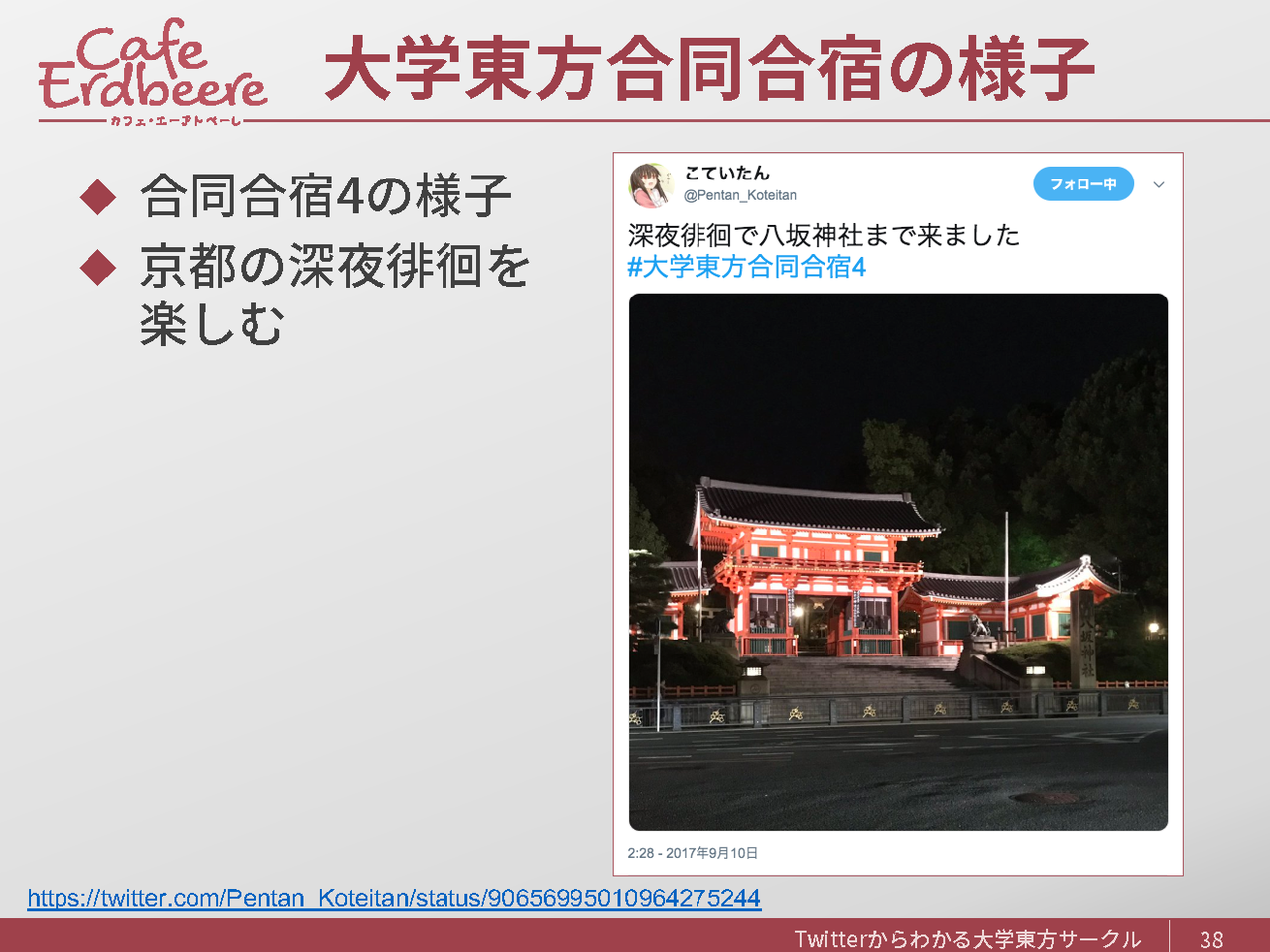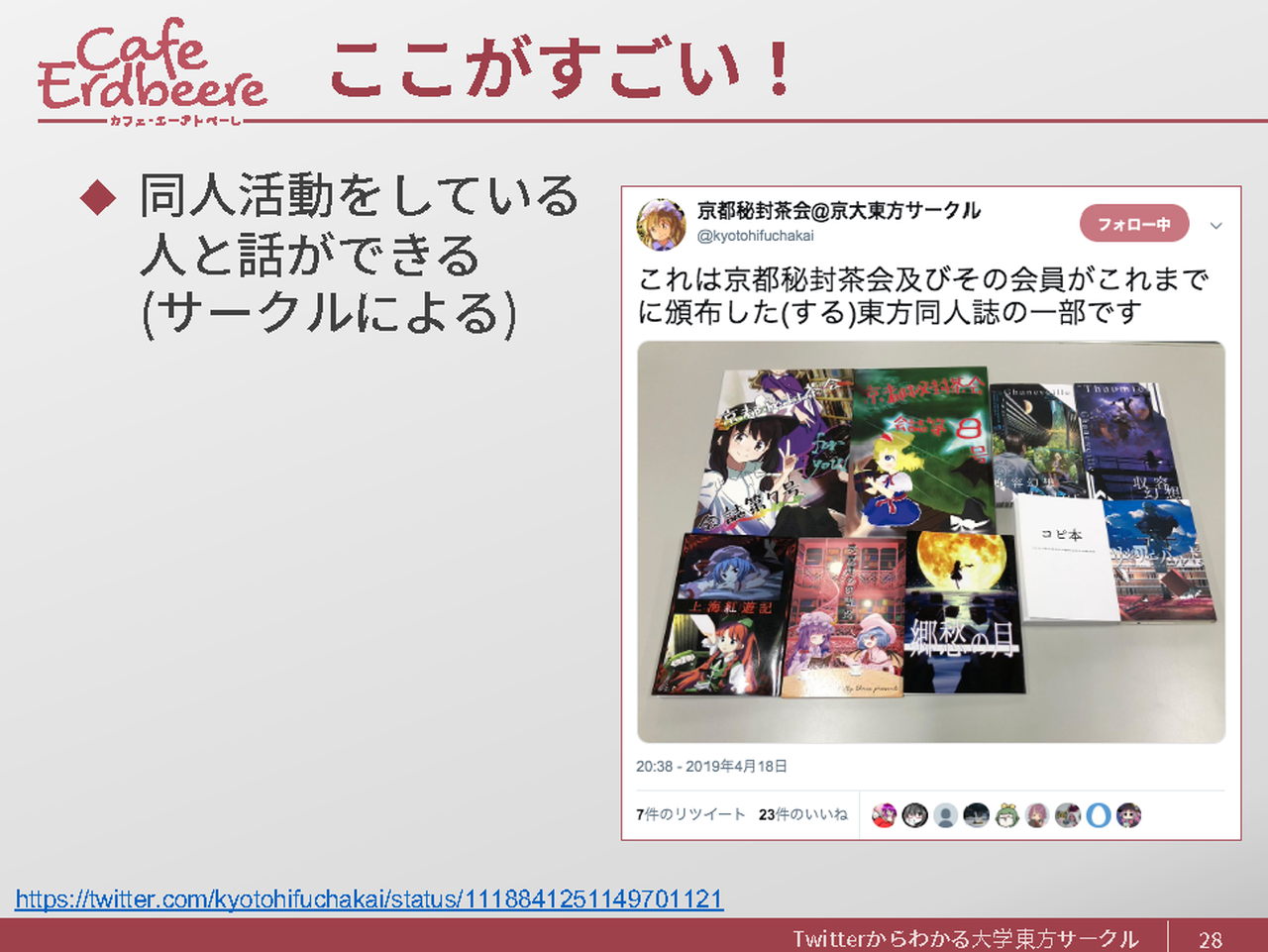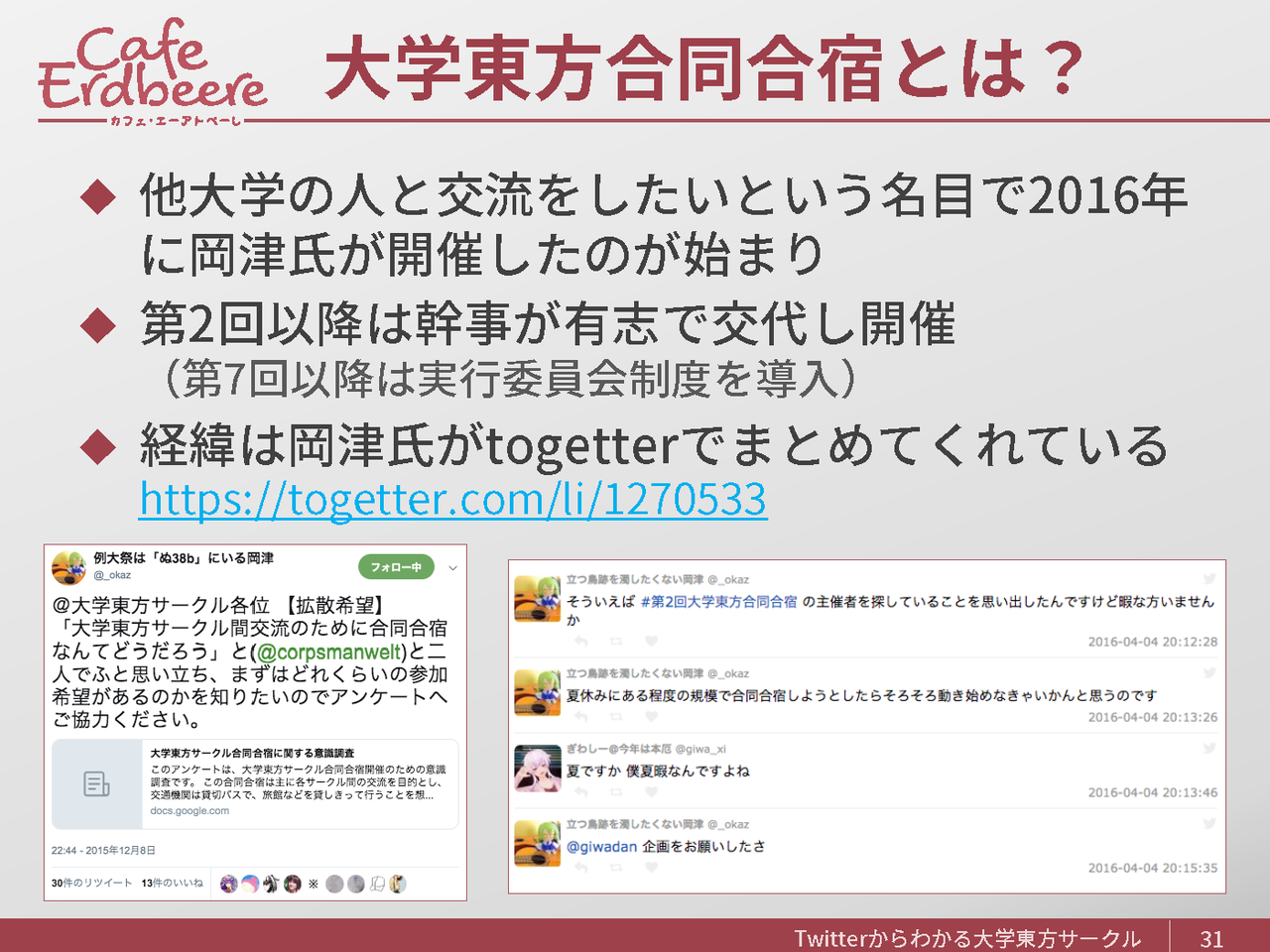 今回はTwitterのツイートを用いて「大学東方サークル」の活動や実態について発表したスライドを掲載させていただきました。引用させていただいたツイートは、各スライドにURLを掲載しておりますので、そちらからご覧ください。