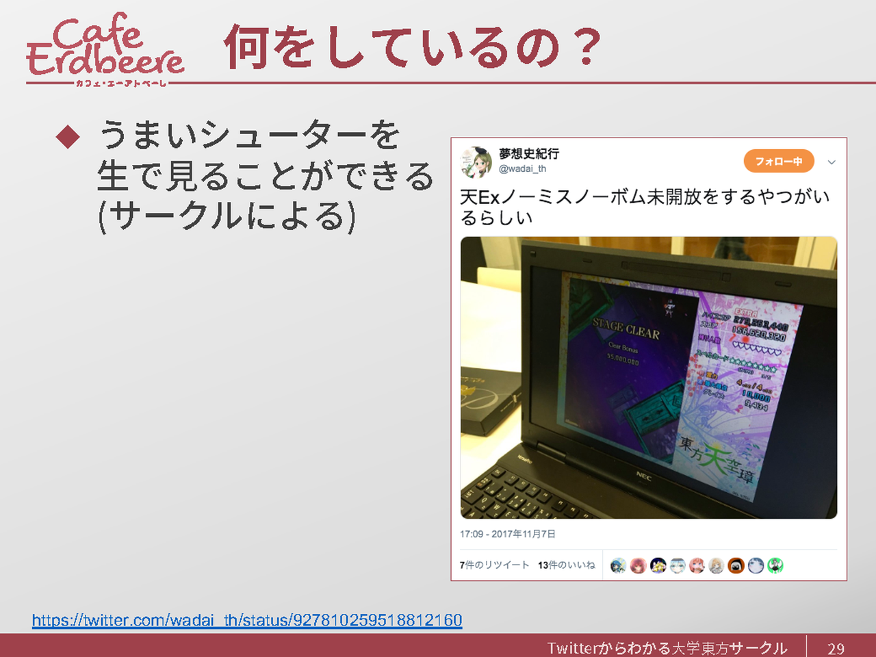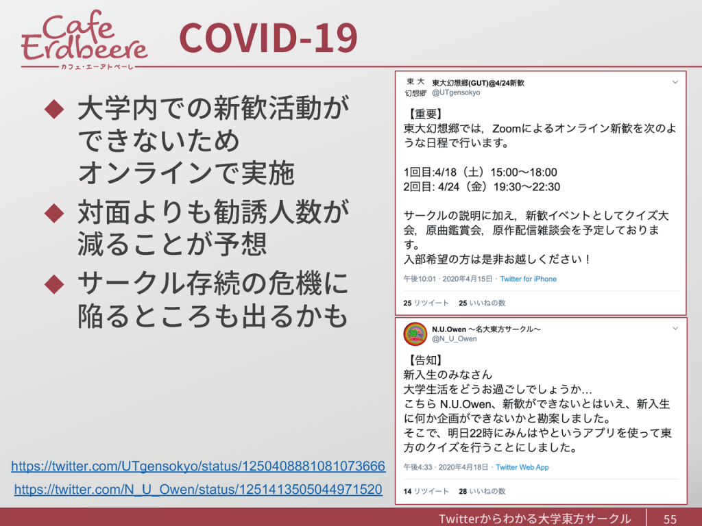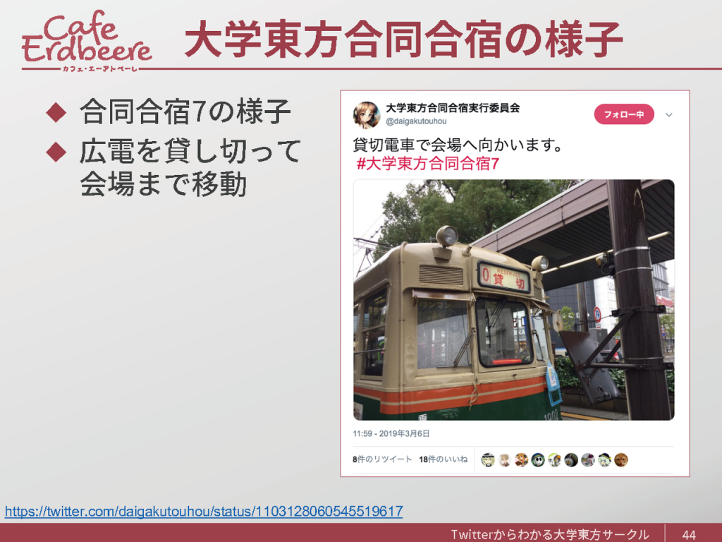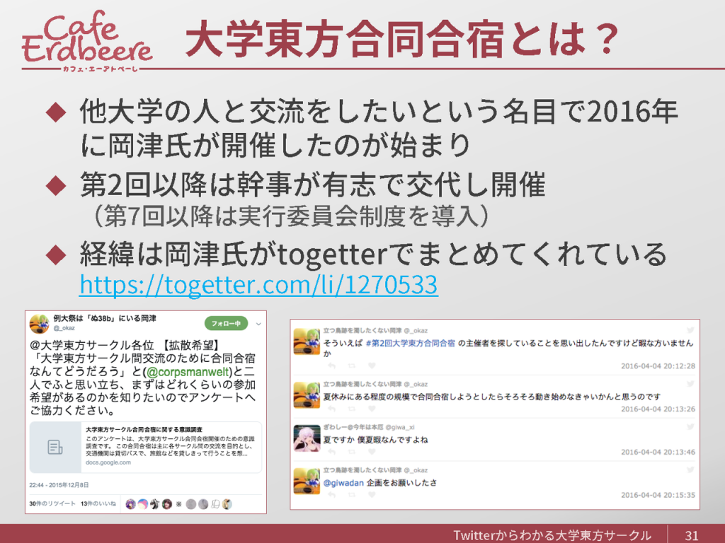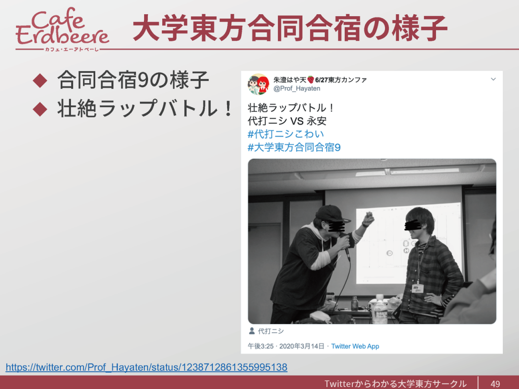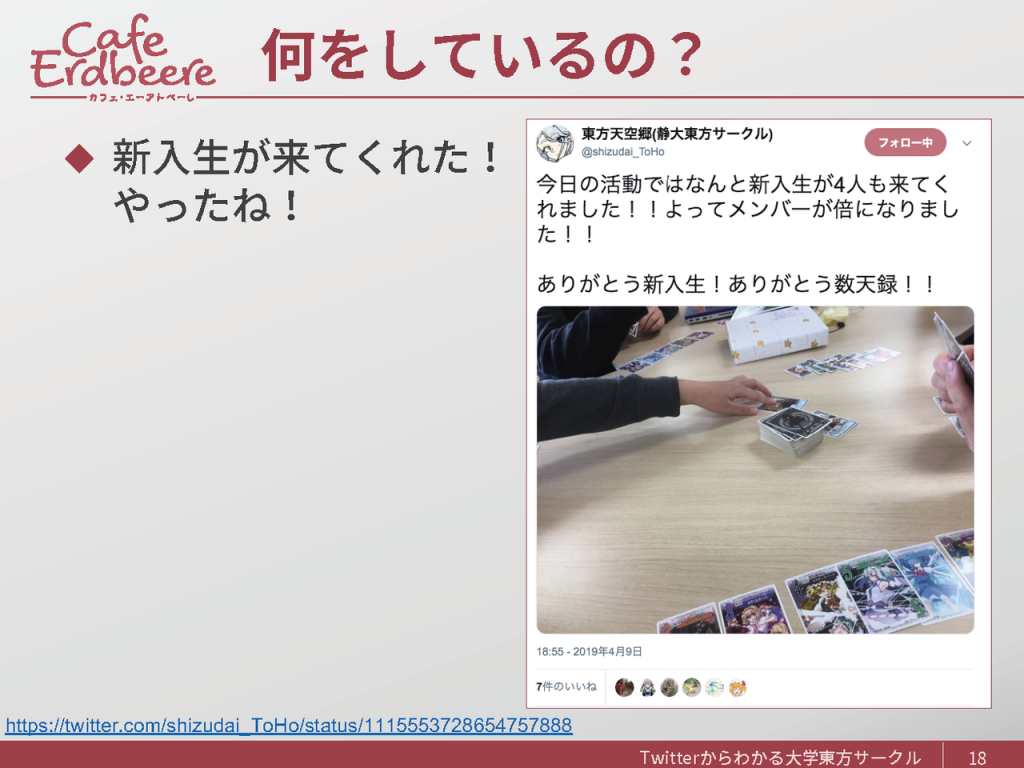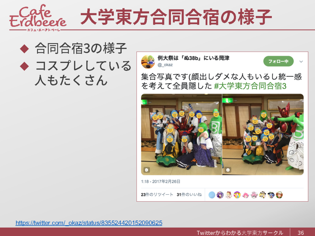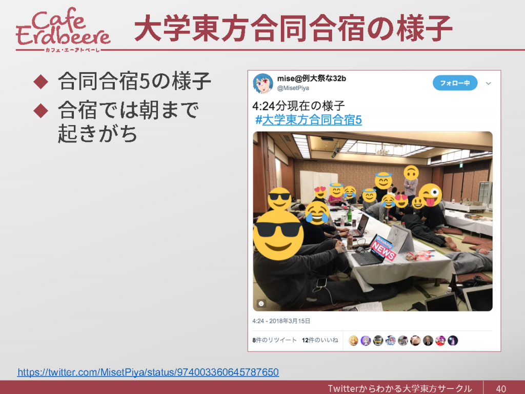 今回はTwitterのツイートを用いて「大学東方サークル」の活動や実態について発表したスライドを掲載させていただきました。引用させていただいたツイートは、各スライドにURLを掲載しておりますので、そちらからご覧ください。