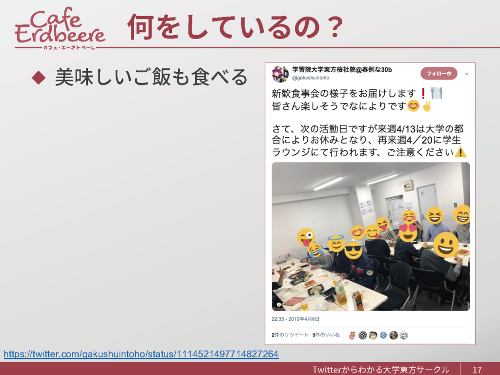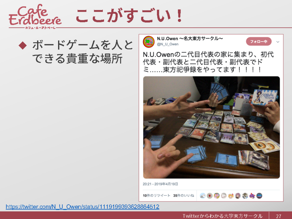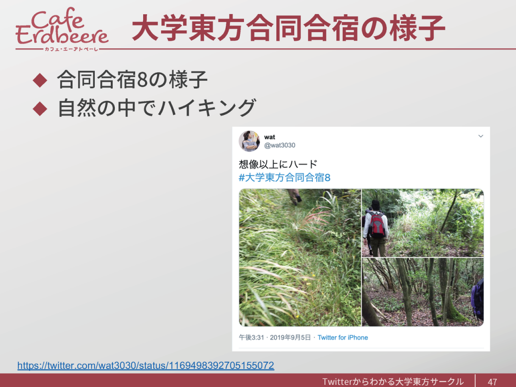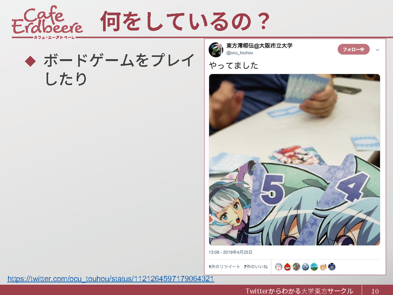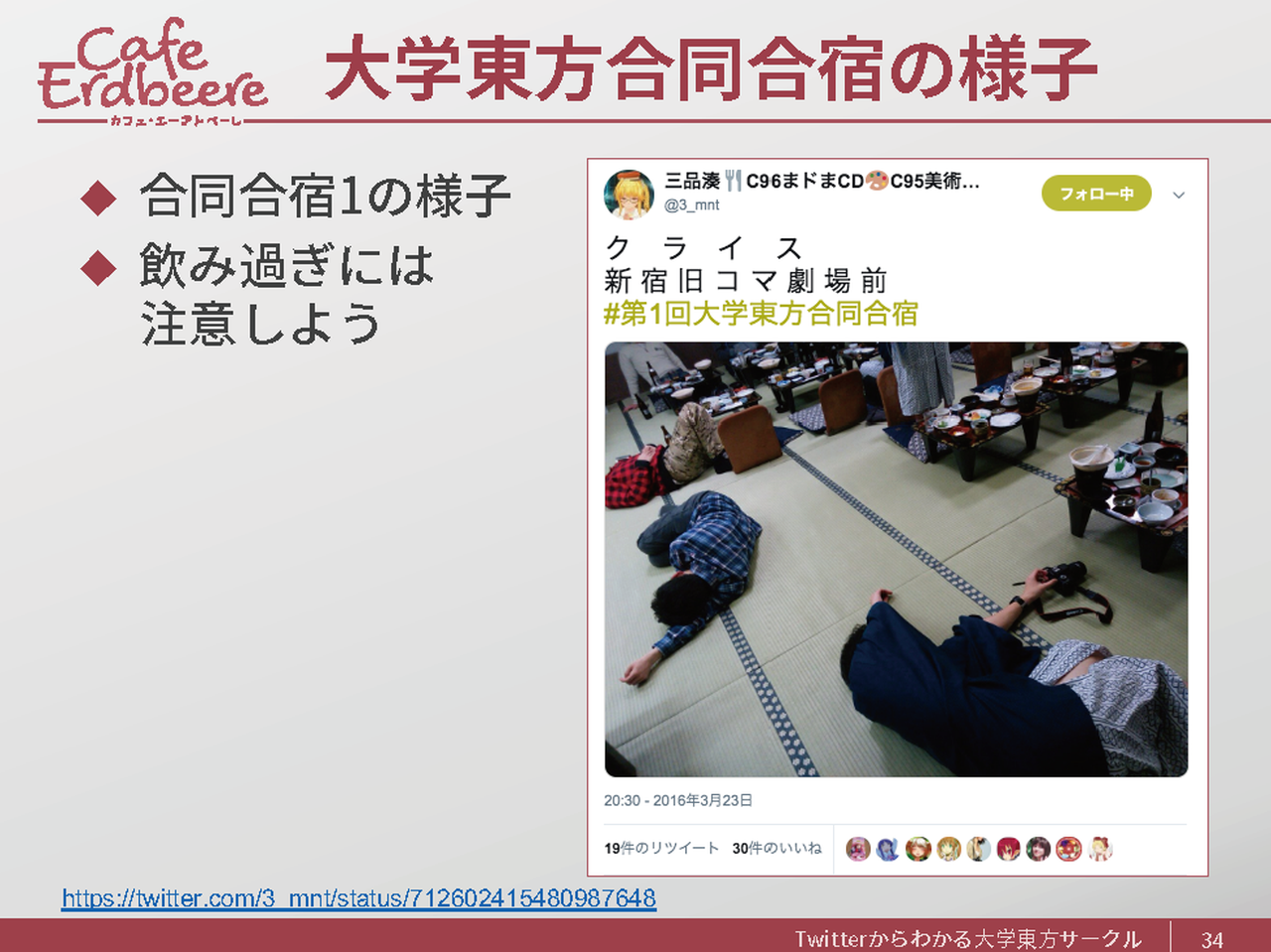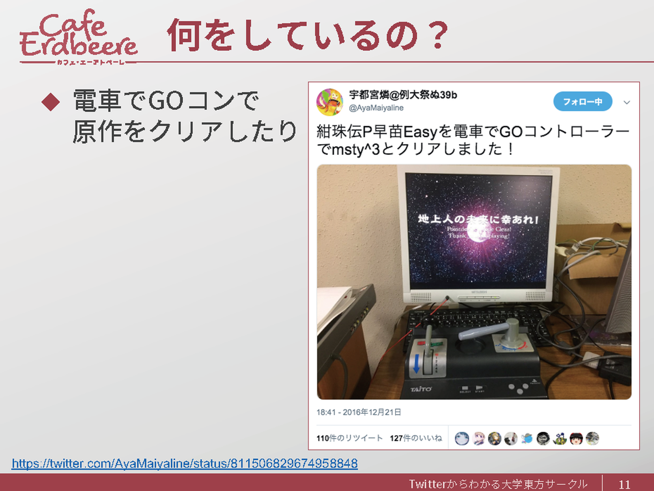 今回はTwitterのツイートを用いて「大学東方サークル」の活動や実態について発表したスライドを掲載させていただきました。引用させていただいたツイートは、各スライドにURLを掲載しておりますので、そちらからご覧ください。