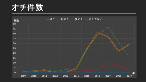 全合計で358件の中からオチているのは185件と、僅かに「オチてない」作品を上回っています。しかしながら、調査の途中途中で、「オチ」ている条件を変更してしまったため、誤差が多くなっています、参考程度に見て下さい。