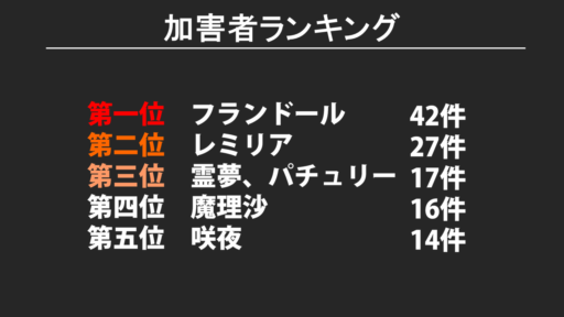 そして加害者ランキングはこちらになります。加害者となる条件は、どのキャラクターが紅魔館爆発のトドメをさしたかとします。