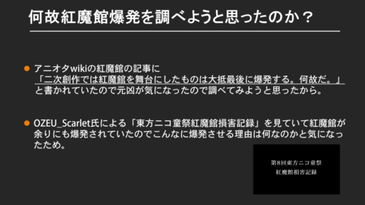 調査を通じて「紅魔館爆発リンク」が付いている動画をニコニコで見ていくうちに、投稿者が「東方の紅魔館が好きだから爆発している」という気持ちを感じ取ったりしました。
