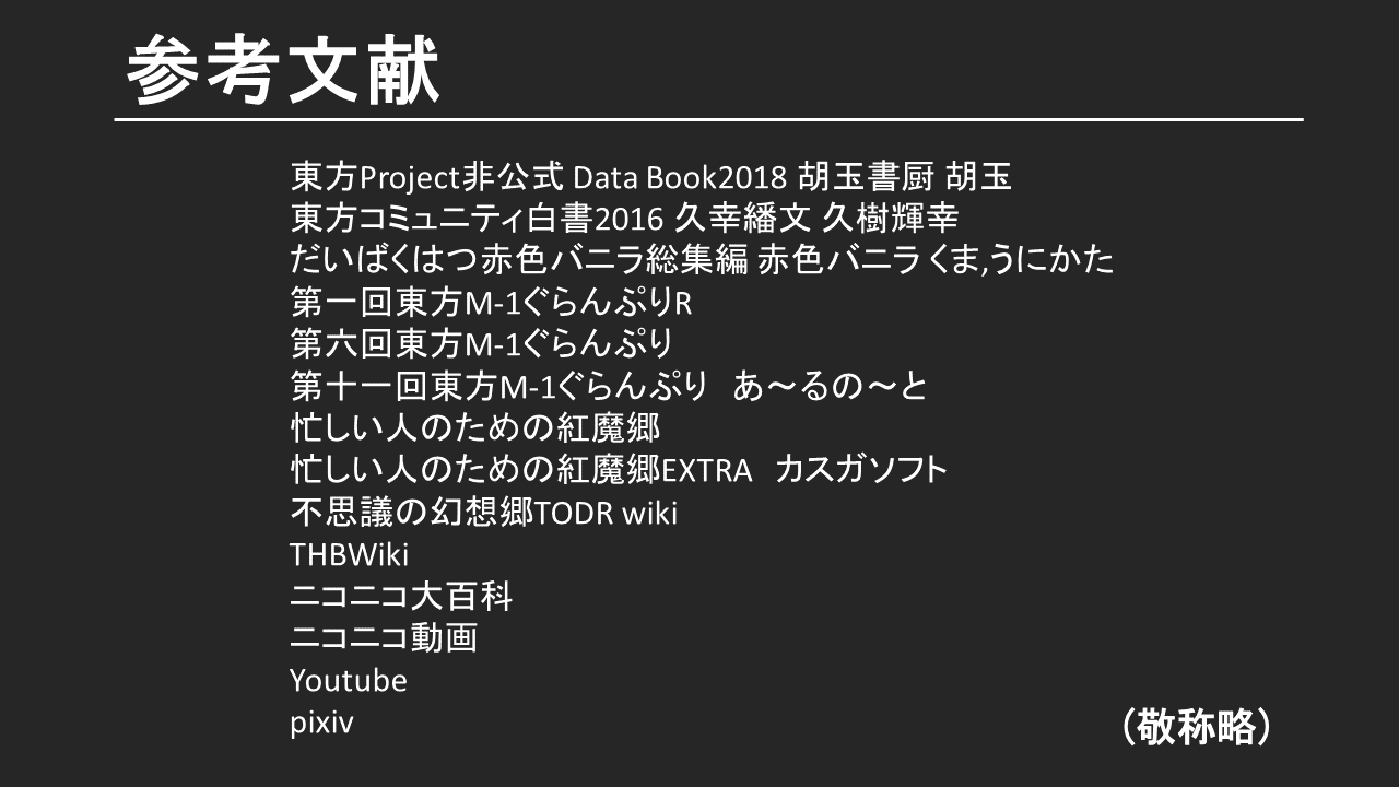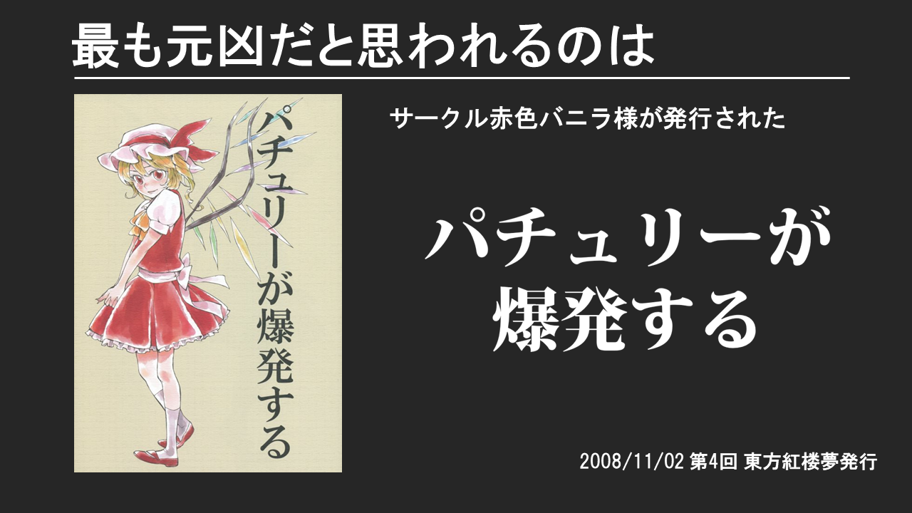 先日行われた「第7回東方発表会」で発表された内容の幾つかを、登壇者の方に許可を取りまして、使用されたスライドを不定期掲載していきます。