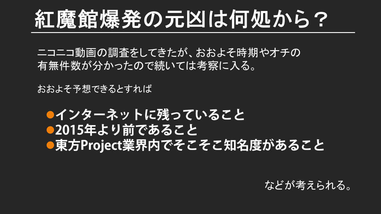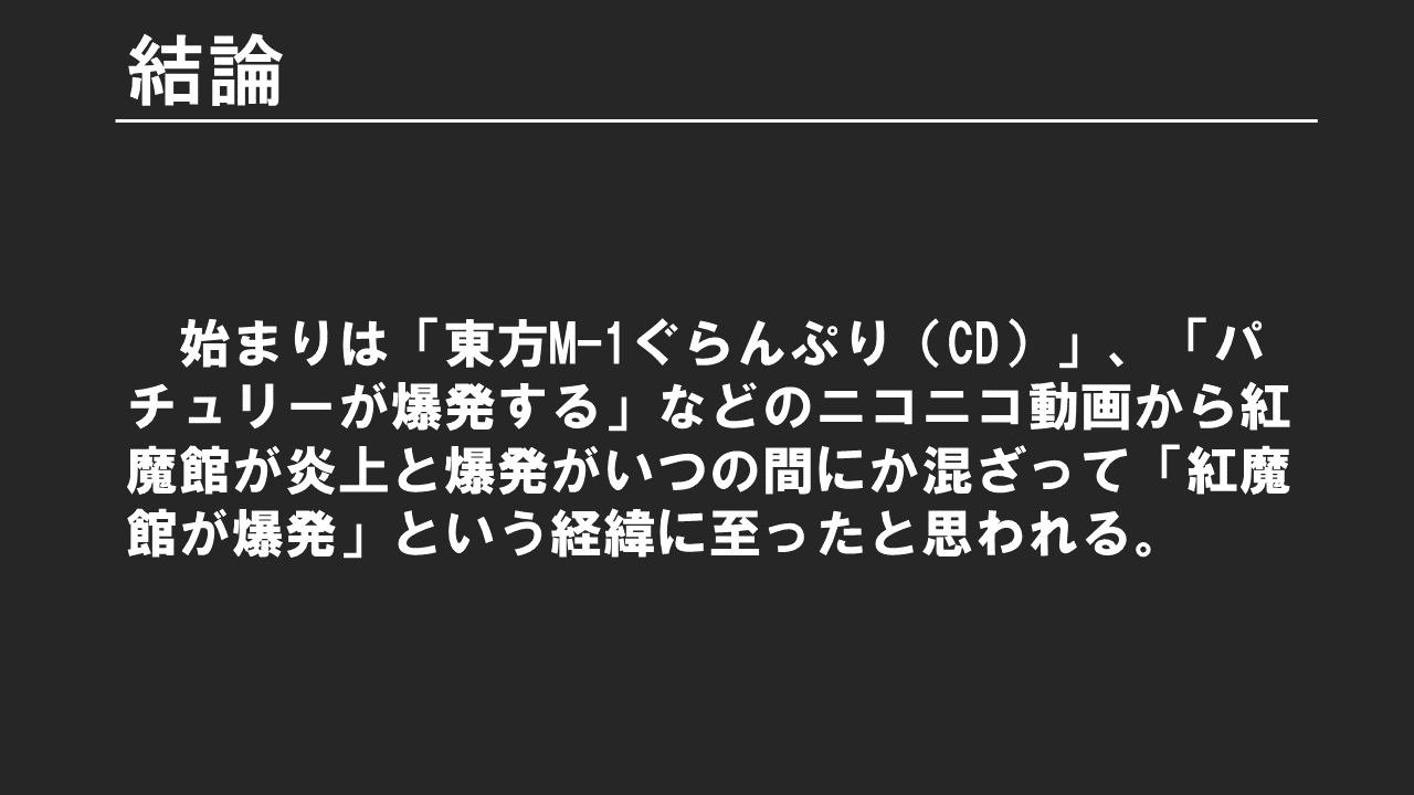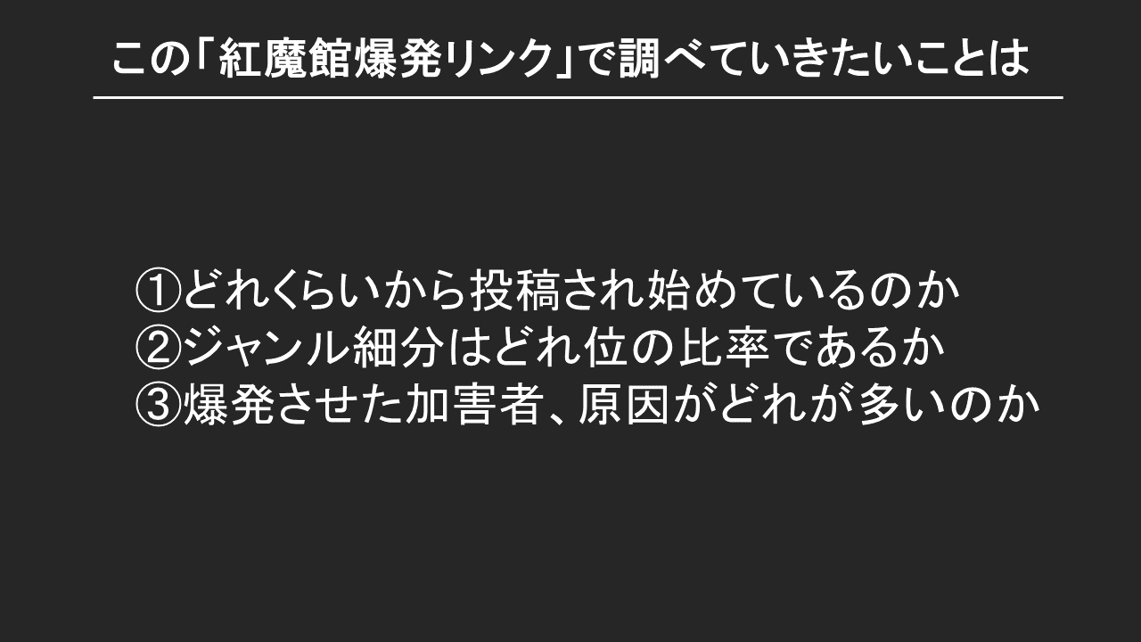 調査を通じて「紅魔館爆発リンク」が付いている動画をニコニコで見ていくうちに、投稿者が「東方の紅魔館が好きだから爆発している」という気持ちを感じ取ったりしました。