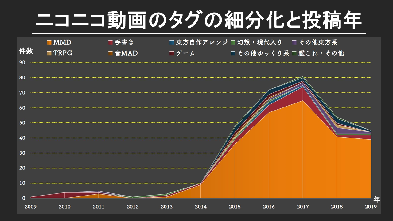表には載せられなかったのですが、「東方ニコ童祭」のタグが付いているものは59件、「MMD杯本選」タグは11件確認できました。また、2015年に入ってからは、ほぼ月に1回程このタグが使用されている事が分かっています。