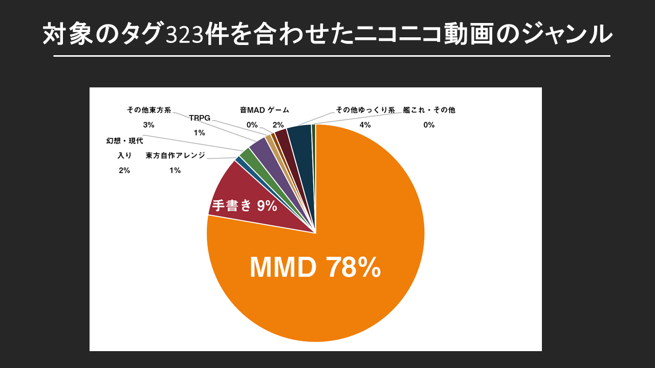 対象のタグ323件を合わせたニコニコ動画のジャンルを分けてみたところ、なんと7割強がMMDである事が分かります。