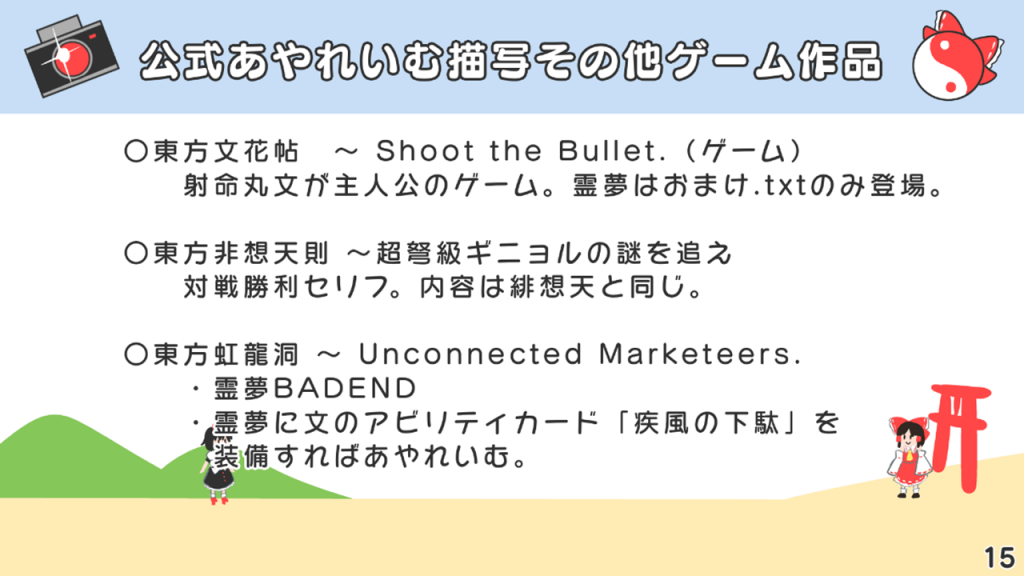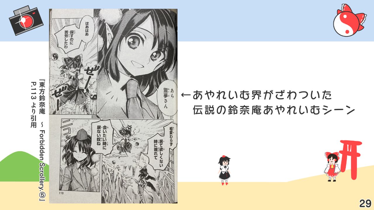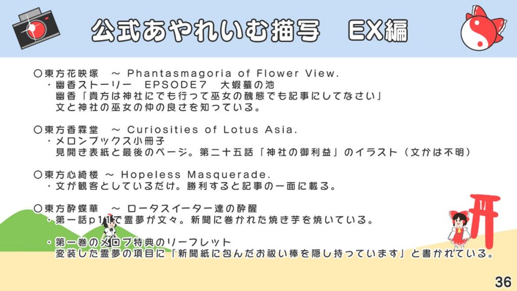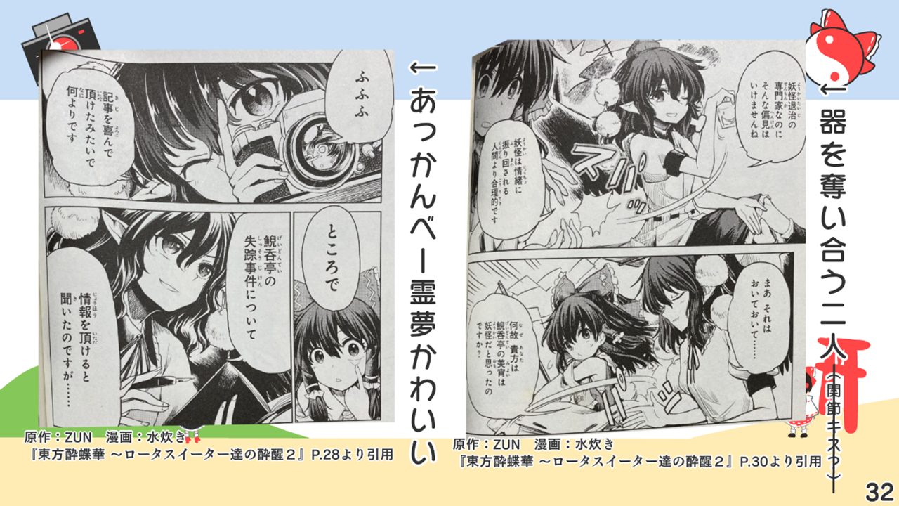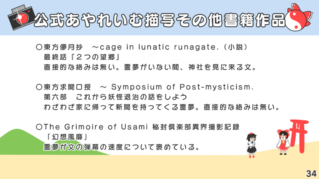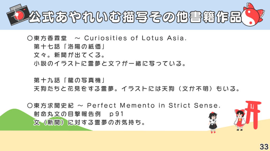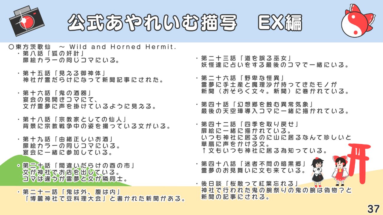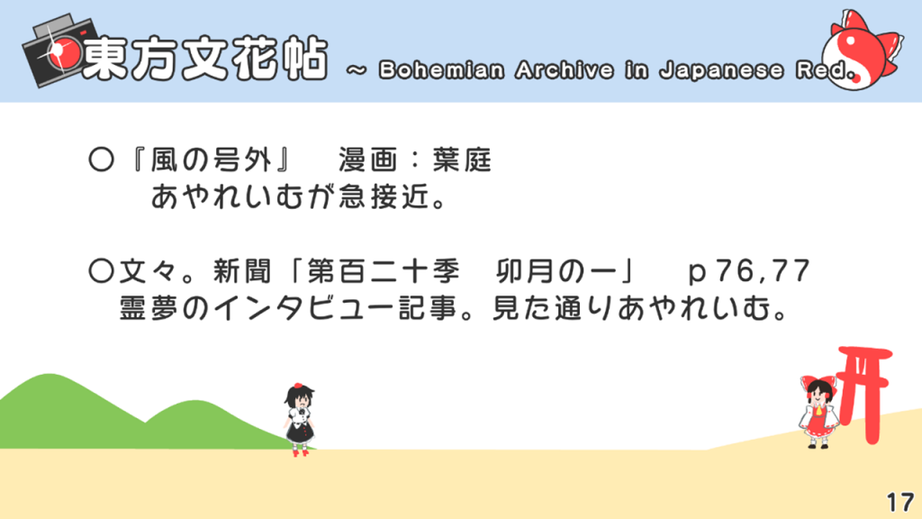 このスライドには書いていないですが、あずまあや先生の画集『はなおうぎ』P.60の9巻ゲーマーズ特典ブロマイドイラストにて天空璋自機メンバーとして霊夢と文が写っていたり、同じく『はなおうぎ』P.103の茨歌仙出張版にて霊夢が文々。新聞を読んでいたりと、細かいところで何かと接点が多い茨歌仙でした。