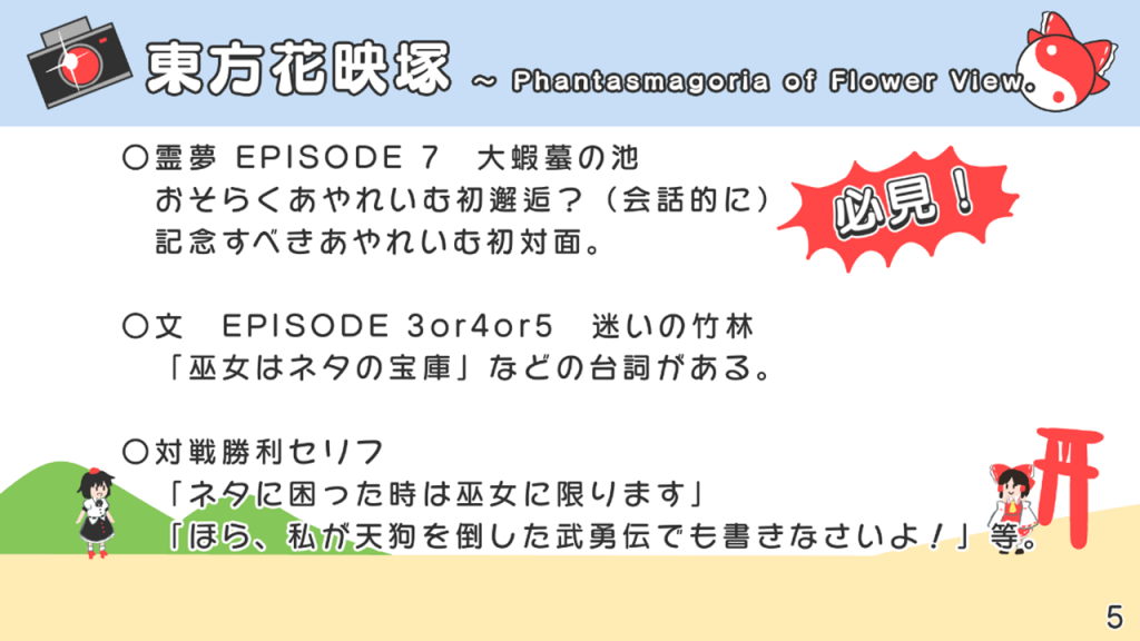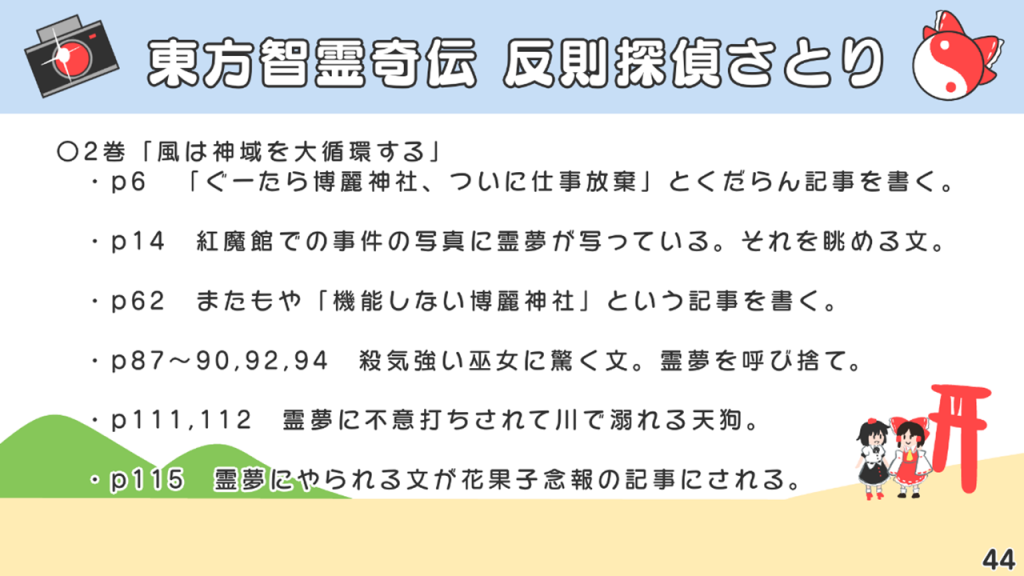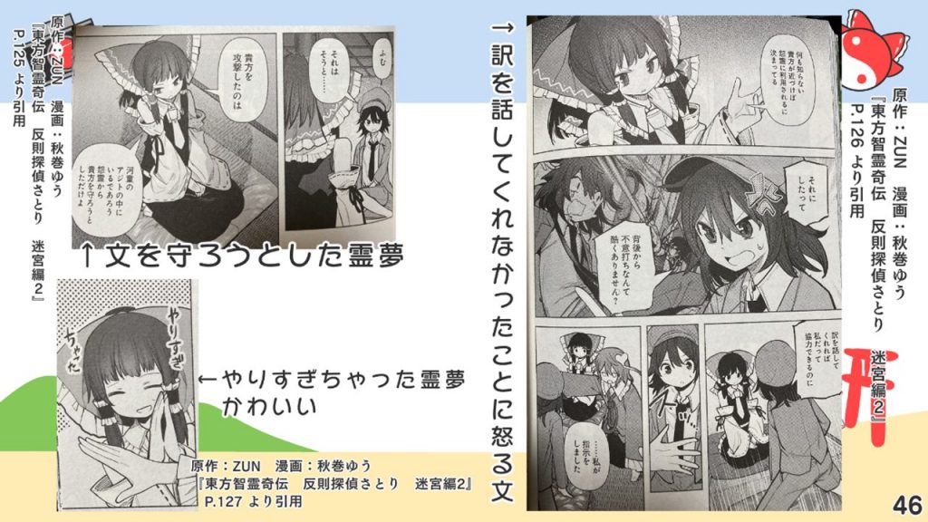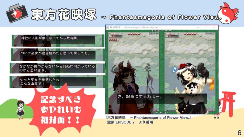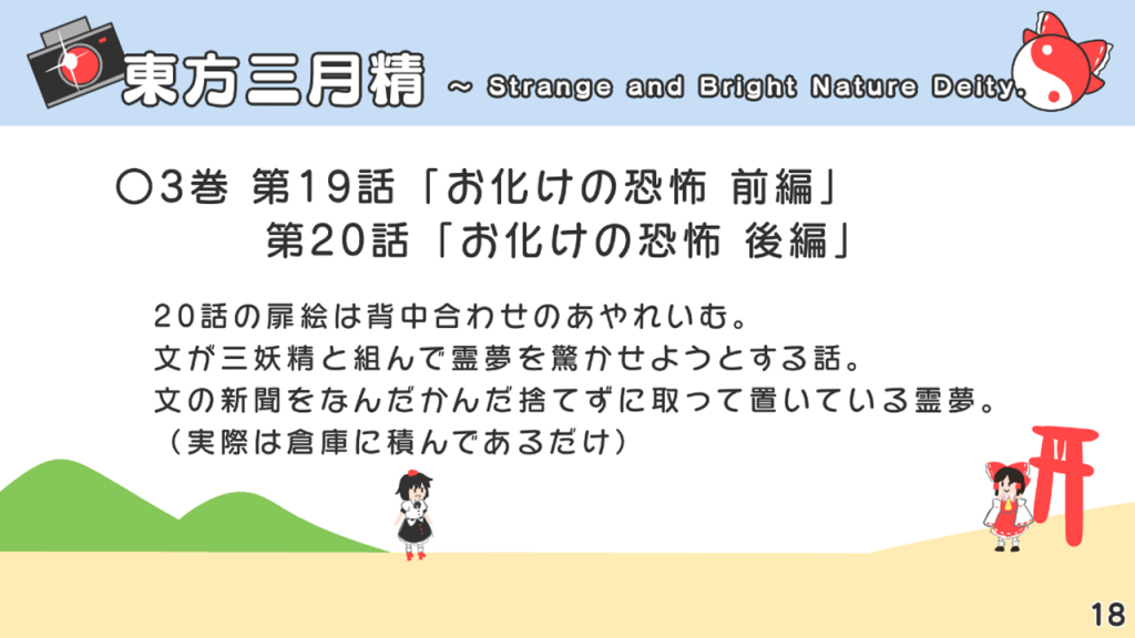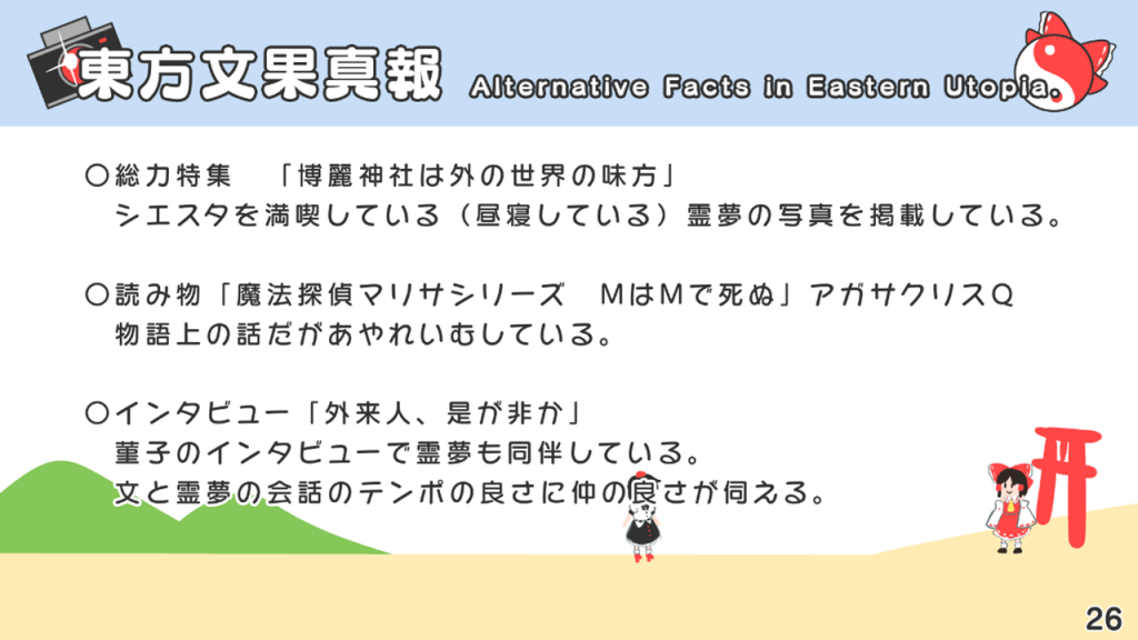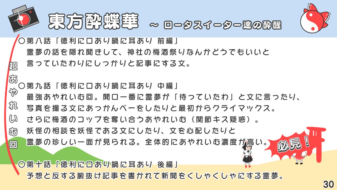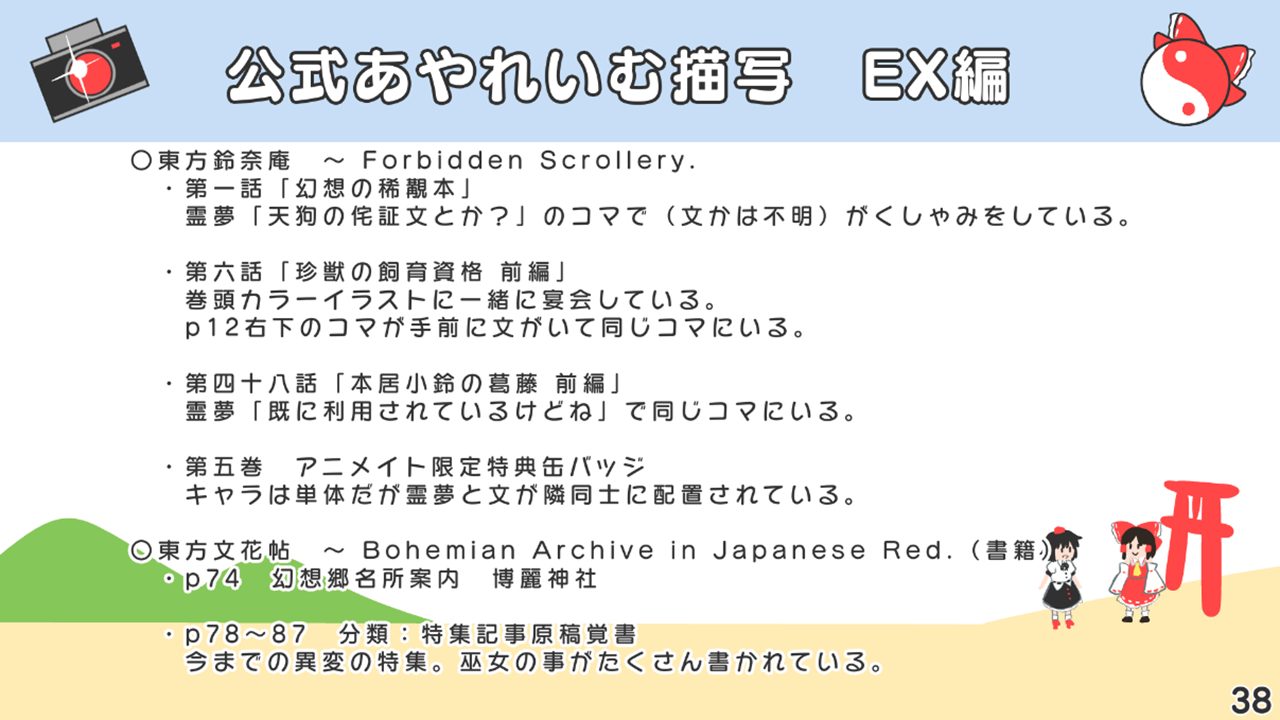 このスライドには書いていないですが、あずまあや先生の画集『はなおうぎ』P.60の9巻ゲーマーズ特典ブロマイドイラストにて天空璋自機メンバーとして霊夢と文が写っていたり、同じく『はなおうぎ』P.103の茨歌仙出張版にて霊夢が文々。新聞を読んでいたりと、細かいところで何かと接点が多い茨歌仙でした。
