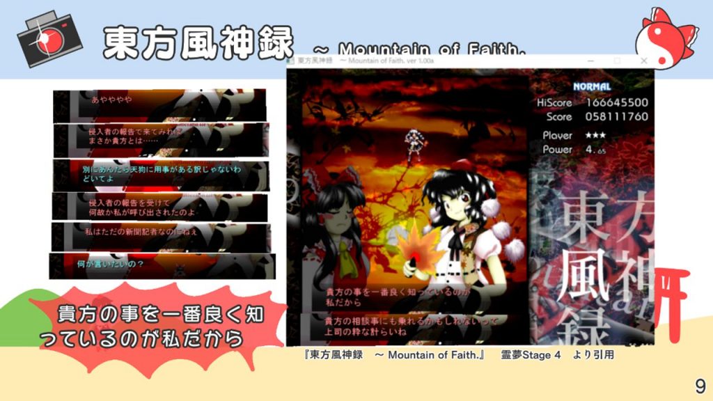 先程の花映塚のセリフ「ですから、我々天狗は貴方達の事を良く知っているのです。」から、この風神録のセリフ「貴方の事を一番良く知っているのが私だから」につながってくるんですね。