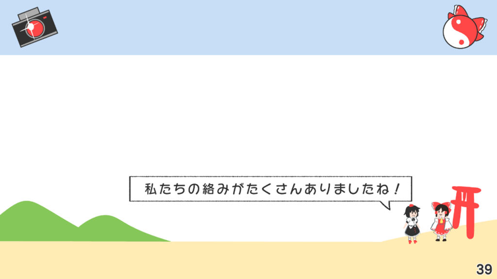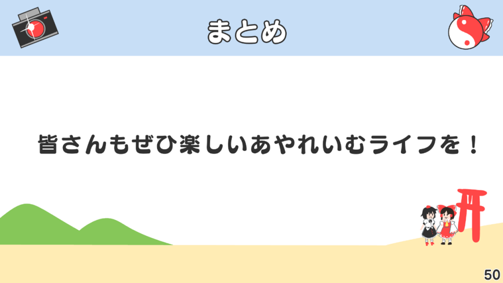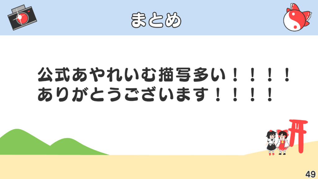それから、このような趣味全開の発表にお付き合いいただいた皆さん、ありがとうございます。あやれいむはいいぞ!