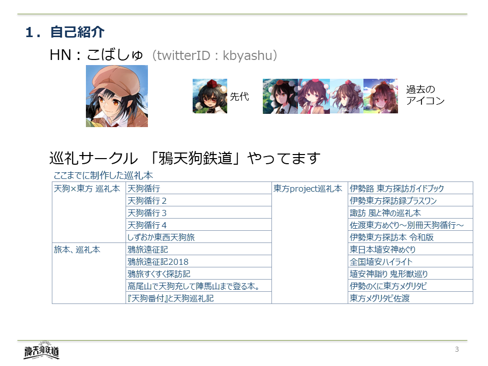 こばしゅと申します。アイコンから分かる通りの文ちゃん勢、花映塚新参です。東方や天狗の巡礼本を制作しています。