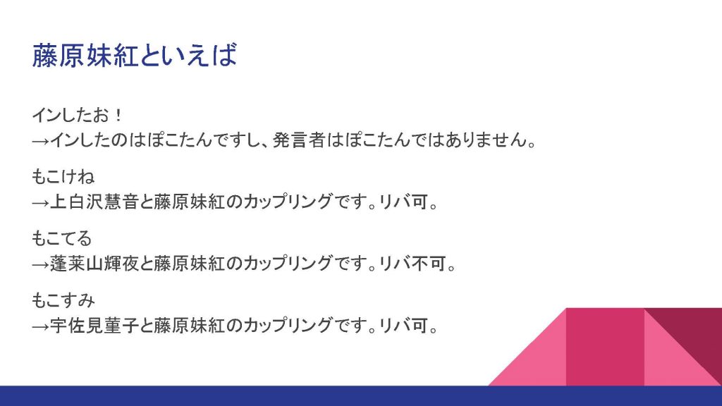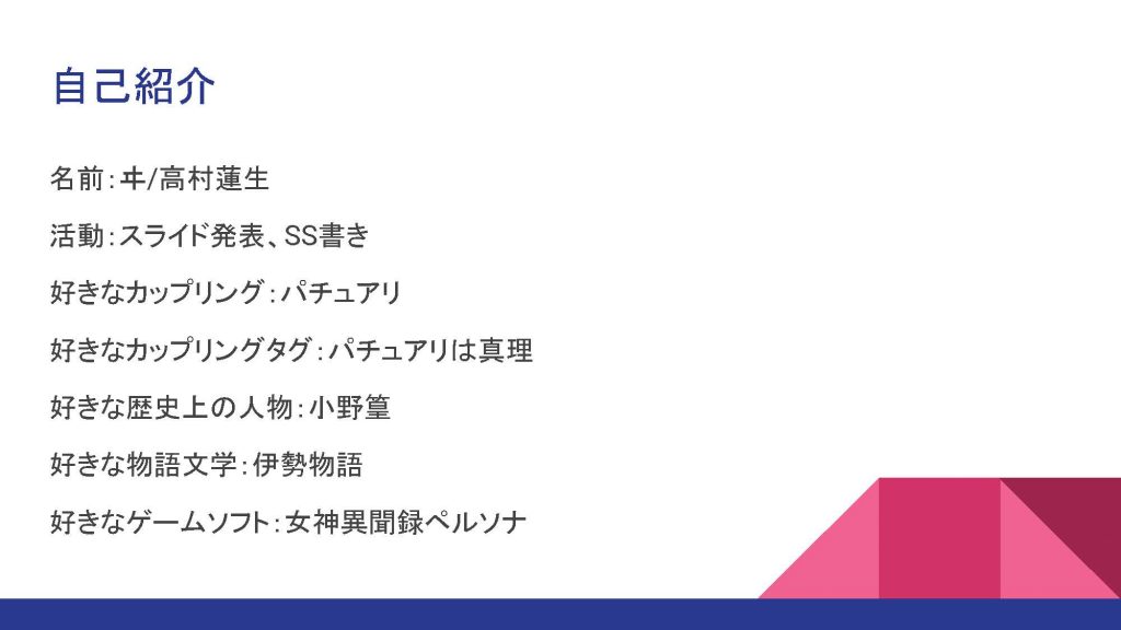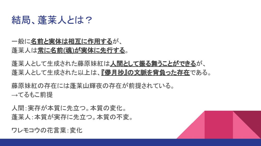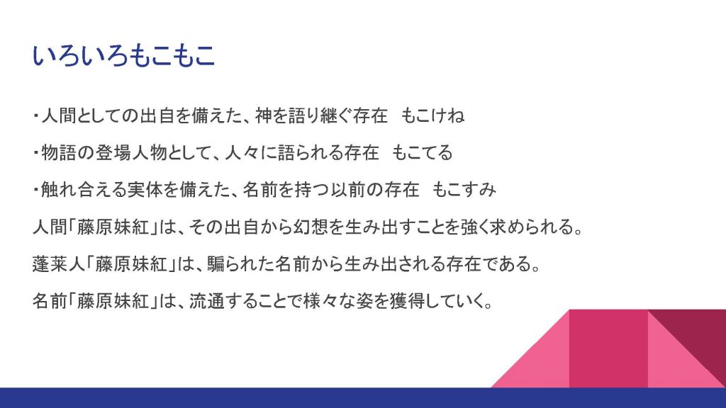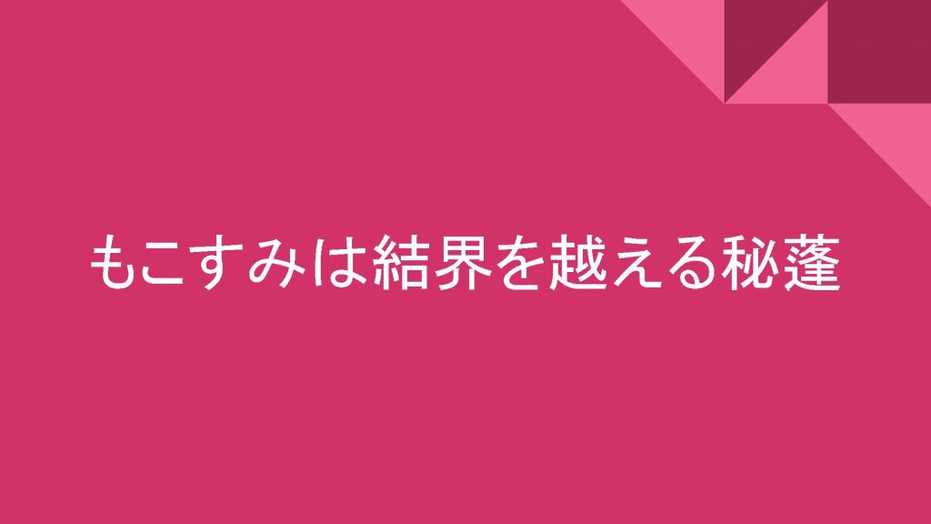 この度、あおこめ様が主催された第12回東方発表会において、藤原妹紅について、三名のキャラクターとの関係を通して解釈する、という内容の発表をさせて頂きました。