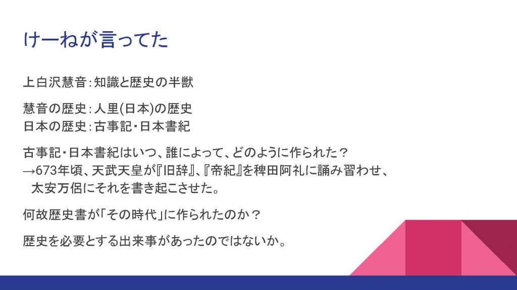 慧音は「知識と歴史の半獣」と呼ばれるわけですが、その歴史とは、具体的に言えば古事記・日本書紀に書かれているものになります。
