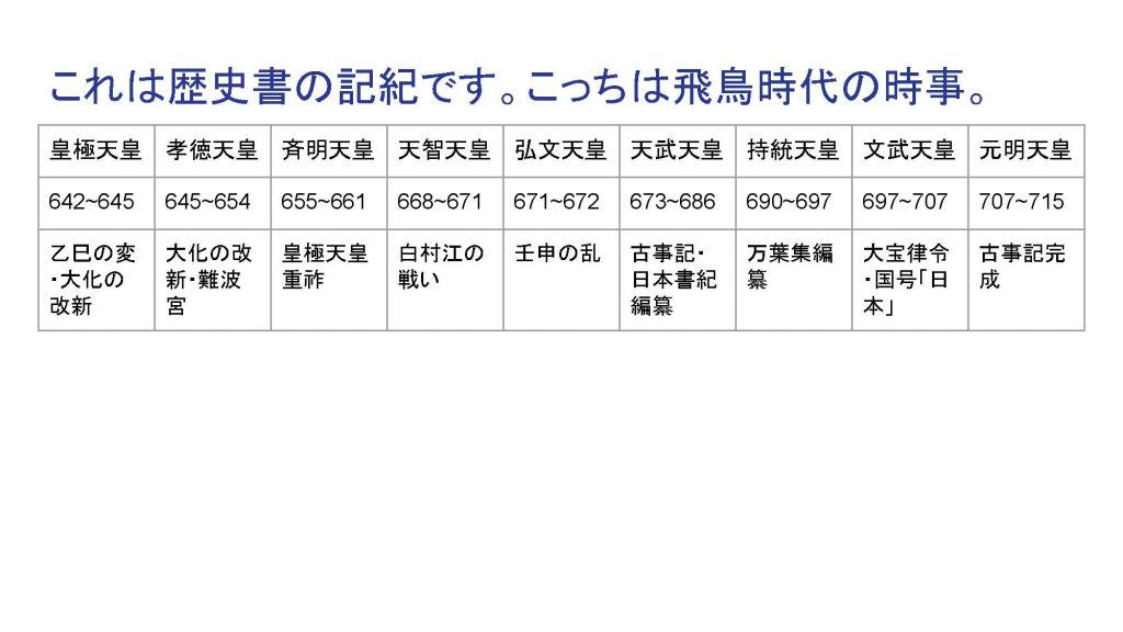 『記紀』・『万葉集』・『大宝律令』・「国号”日本”の宣言」などを天皇家の名の下に実現していったのは、白村江の戦いにおける敗戦を期にそれまでの混乱した国内情勢をまとめ上げ、一つの国家として歩んでいくための下地作りであったと解釈できます。