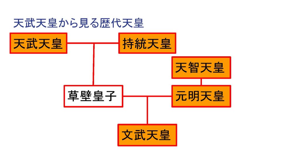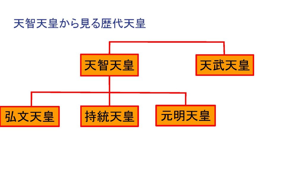 天智天皇(中大兄皇子)から見ると、天武天皇(大海人皇子)は弟、弘文天皇・持統天皇・元明天皇は子供にあたります。この辺の時代の天皇家は関係が非常に複雑で、視点を変えると家系図も変わります。