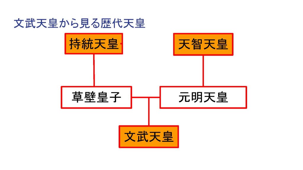 ごちゃごちゃしているので、文武天皇から見て父系と母系に整理します。祖母に当たる持統天皇は、同時に祖父でもある天智天皇の娘なので叔母に当たるのですが、些細な問題です。