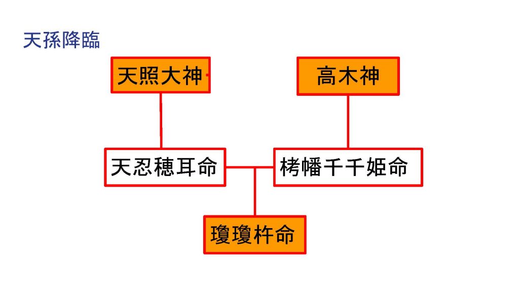 なんと、偶然にも天孫降臨の系図とピッタリと重なるではありませんか。わざとですが。