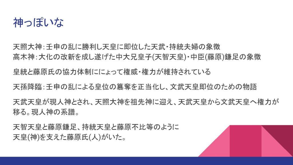 「天孫降臨によって天照大神に命じられた瓊瓊杵命が豊葦原中国に君臨した」という神話は、持統天皇から孫の文武天皇に皇統が繋がる構図とパラレルであると言えるでしょう。祖母から孫に皇位が継承されることを正当化する物語ですね。このとき、天皇家の祖先神としての天照大神が誕生した、と言えるかもしれません。
