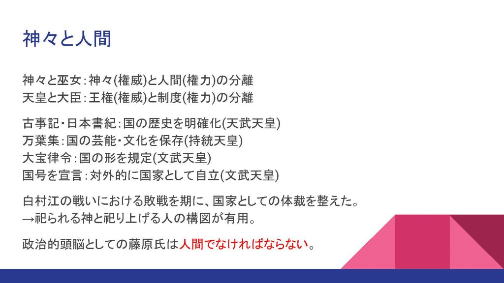 神々と巫女が権威と権力を分担するように、天皇と大臣が権威と権力を分担するという構図は、藤原氏から始まったものではありません。聖徳太子の時代、天皇家と蘇我氏と物部氏という形でも現れていました。藤原氏は、明確に神と人という形に分けて政治システムを組み上げたと言えるかもしれません。
