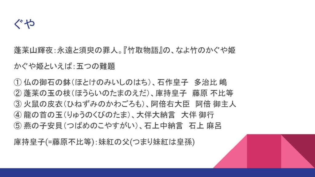 蓬莱山輝夜がなぜ”ぐや”と呼ばれるかと言えば、「ほうらいさんかぐや」を「ほうらいさんorぐや」と曲解したからだとかなんとか。さておき、蓬莱山輝夜と言えば『竹取物語』のかぐや姫その人であり、有名なエピソードには五人の貴公子と五つの難題があります。