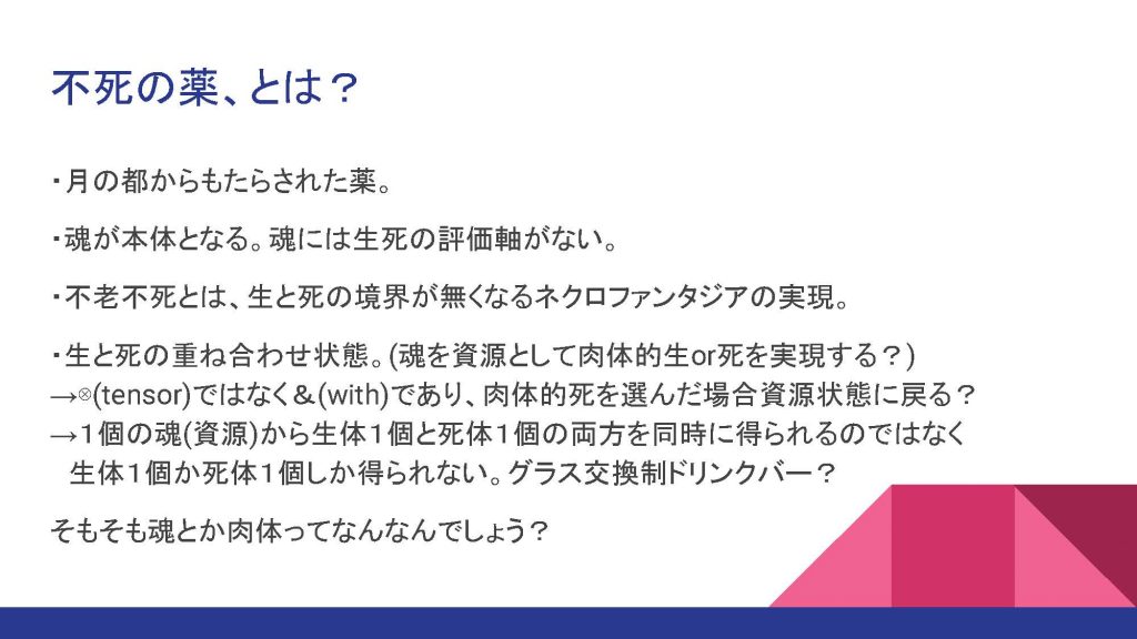 魂が本体であるならば、魂は物理的対象ではないので、蓬莱人は物理的対象ではないということになります。また、生と死の重ね合わせについても、生死についての物理的な関係ではなく、論理的な関係についての話だと解釈できます。論理的な重ね合わせ関係についてならば、線形論理の結合子がヒントになりそうですね。何を言っているんだ。
