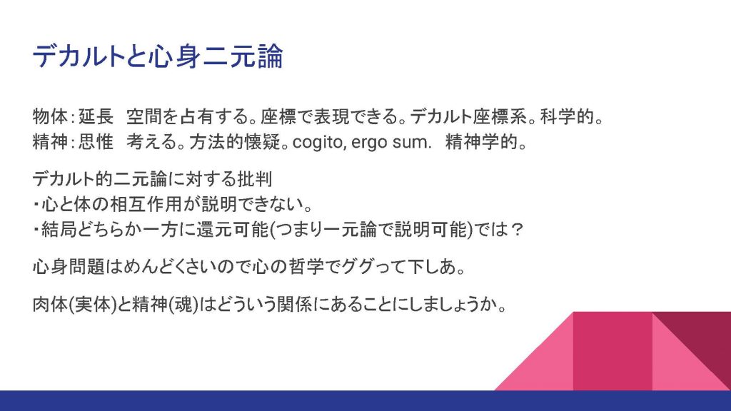 延長とはつまり、空間上に座標で表すことができるということであり、実際に直交座標系はデカルト座標系とも呼ばれています。思考とは所謂デカルトのコギトのことであり、私の基盤は思考にあるということです。まあ、デカルト本人も、これあんまり筋が良くないなって思ってたみたいですが。