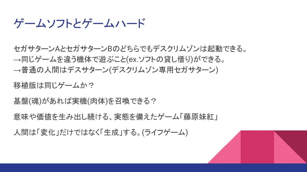 これはあくまで例え話であり、普通の人間は魂と実体が一対一対応しているので、ソフトとハードの話で言うとデスサターン状態を脱せなくなります。人間の魂と実体は、ゲームソフトとゲームハードのように綺麗に切り離せるものではない、と言うべきかもしれません。