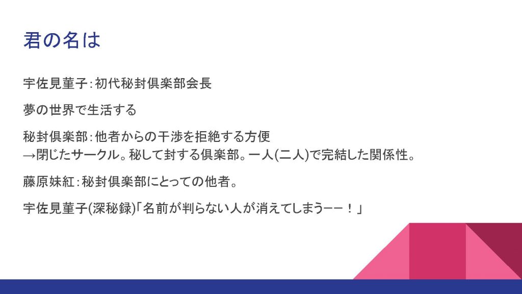 宇佐見菫子にとっては現実世界も幻想郷も本質的な差異などなく、どちらで出会ったにせよ他者は他者であり、たまさかに幻想郷において現実よりもよりリアルな他者との触れ合いを経験している、と言えるでしょう。