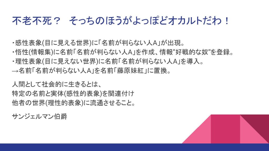 サンジェルマン伯爵なんかは、割とこんな感じで名前が生き続けて、過去に行ったり未来に行ったりしている状態だと思われます。