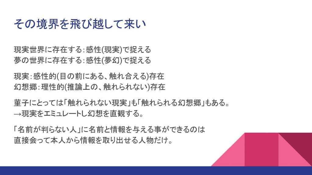 現実と幻想郷とをどれだけ細かく区別したところで、世界について何かが分かるかと言えば、非常に怪しいかもしれません。世界について詳しくなるということは、断片をどれだけ蒐集したかということではないのですから。