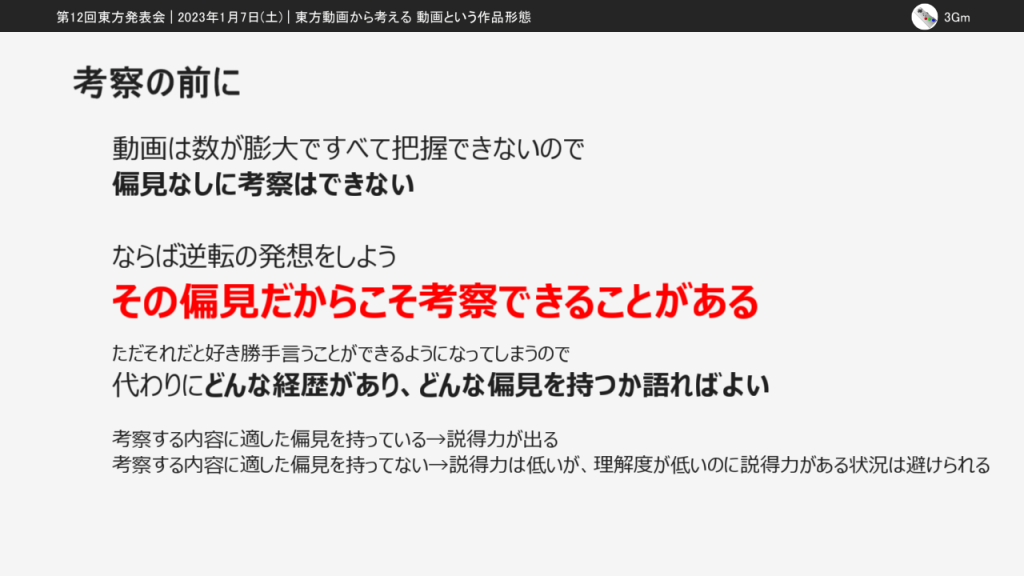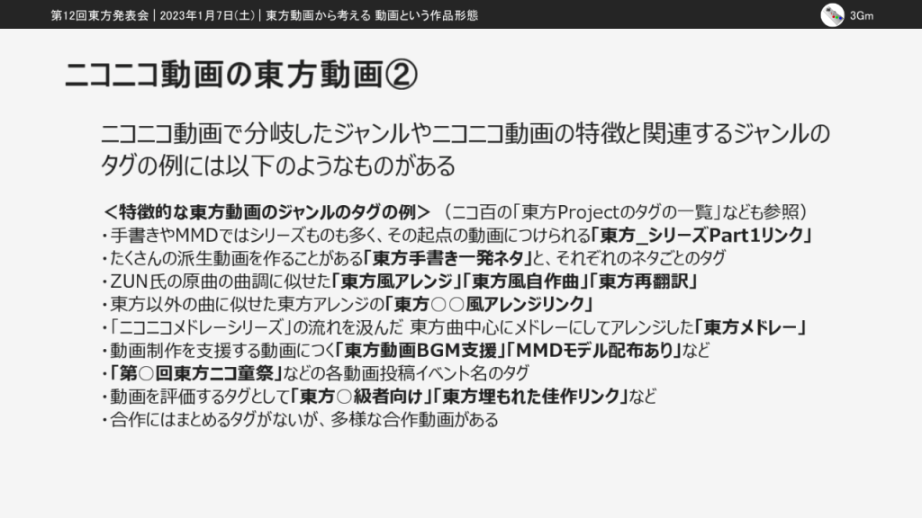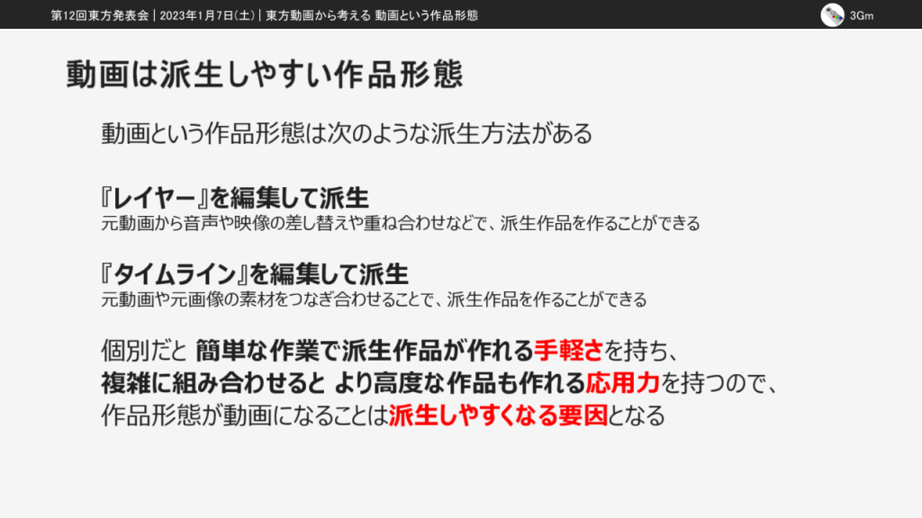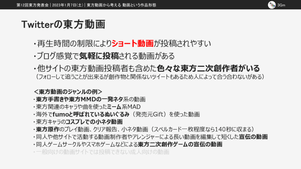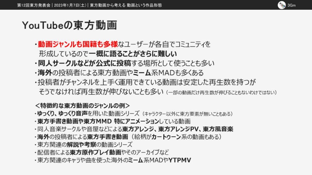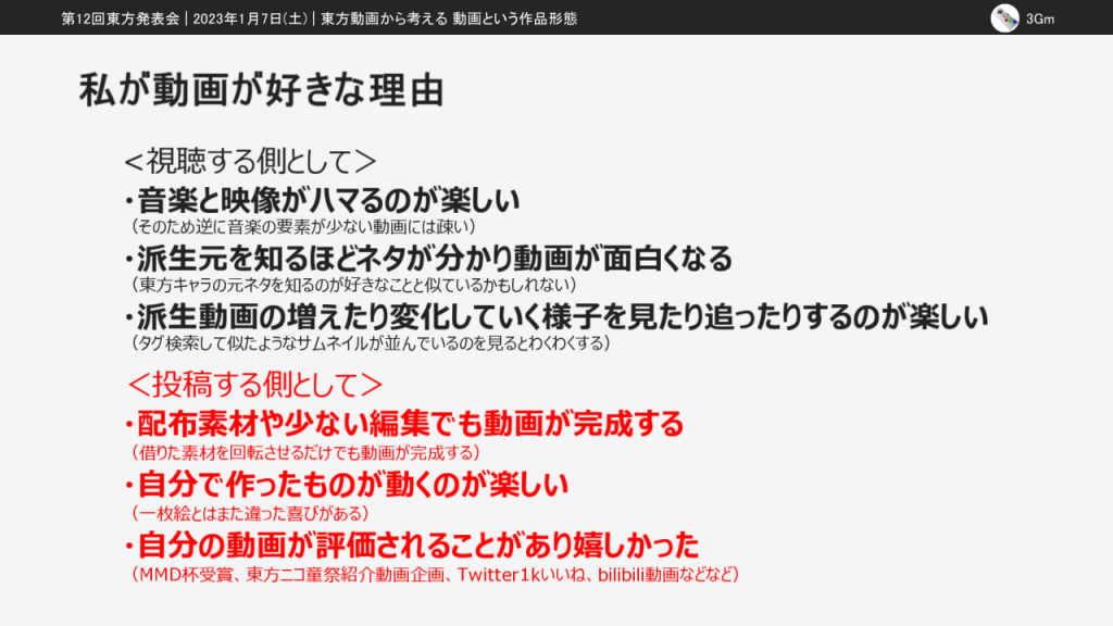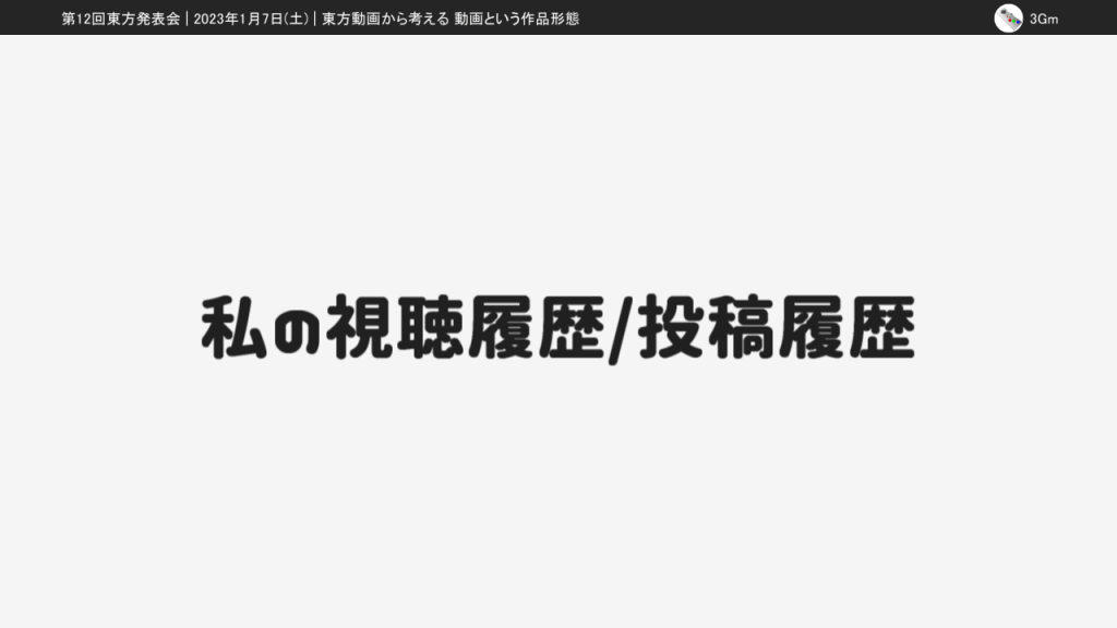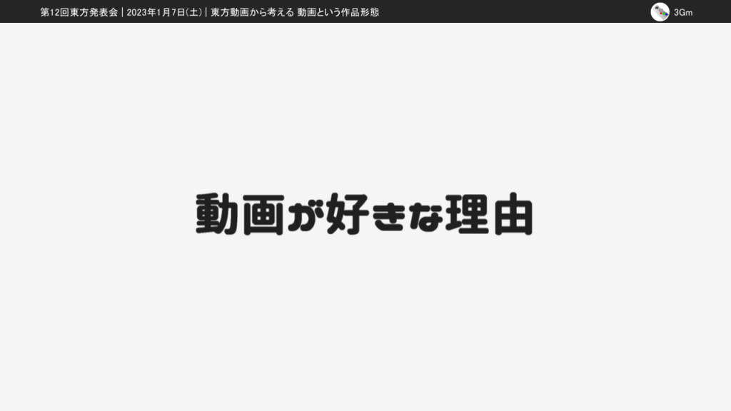 今回の東方発表会では「東方動画から考える動画という作品形態」という発表をしました。