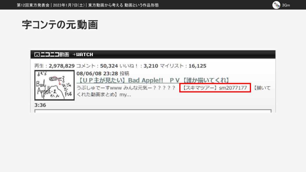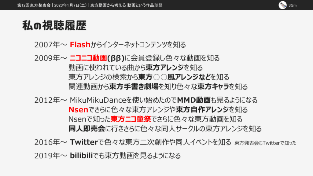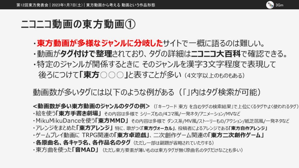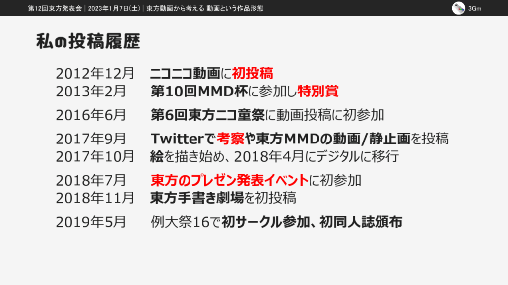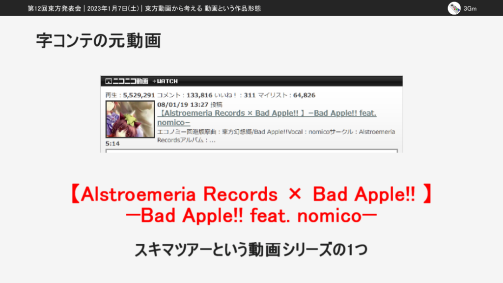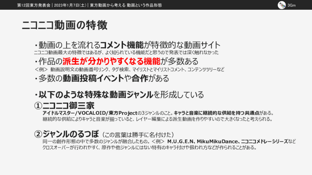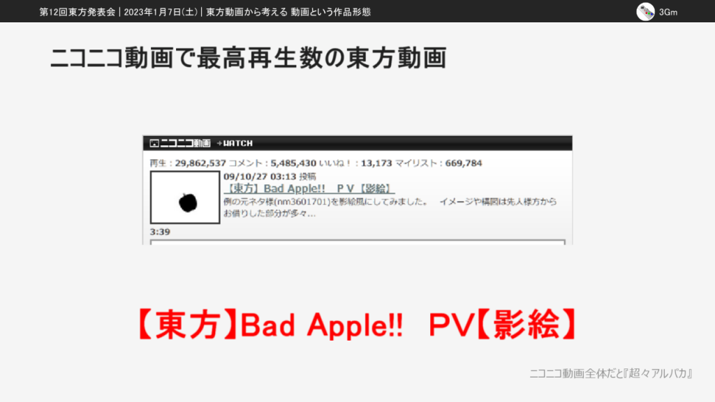 なお、この発表は第14回東方ニコ童祭の生放送企画で個人として放送した「ニコニコ動画と東方動画を考察する」の内容を再編集したものです。この記事での掲載にあたって一部編集しているので、東方ニコ童祭版とも東方発表会版とも異なる部分があります。