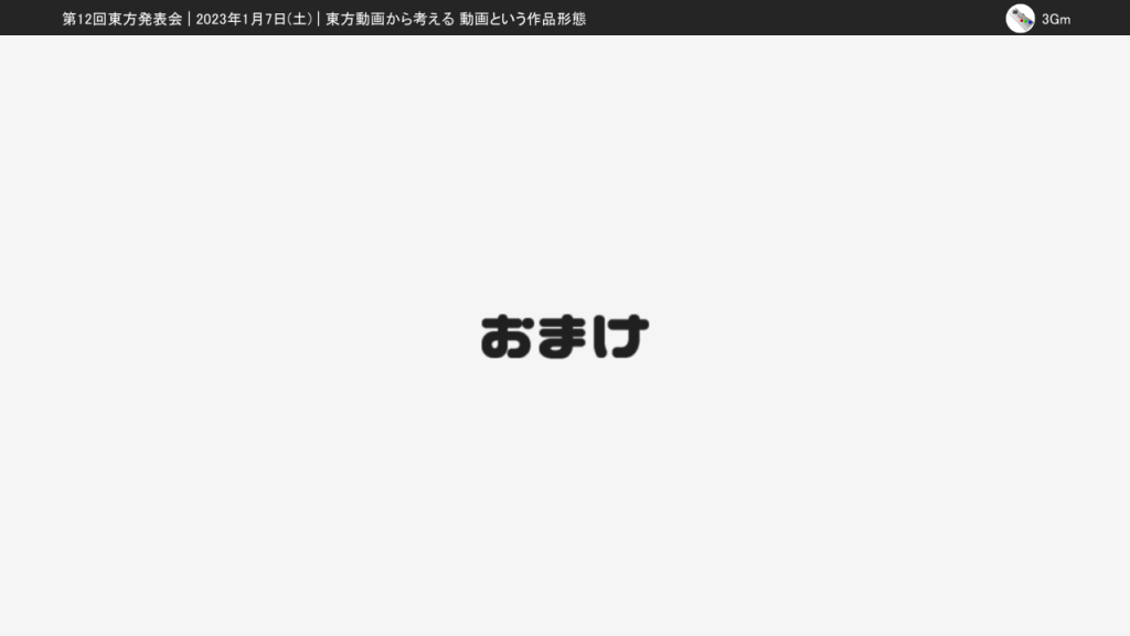 ということで、この発表や記事を通して東方動画やその派生に対する理解や興味を深めたり、実際に色々な動画を見たり投稿したりするきっかけになれば幸いです。
