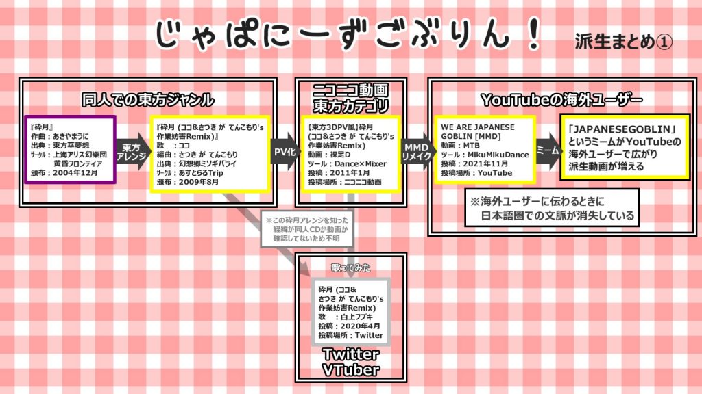 始めは同人の東方ジャンル内での派生ですが、2011年にニコニコ動画の東方カテゴリに派生後、約10年後の2021年11月にYouTubeの海外コミュニティに派生して「JAPANESE GOBLIN」というミームを形成しています。