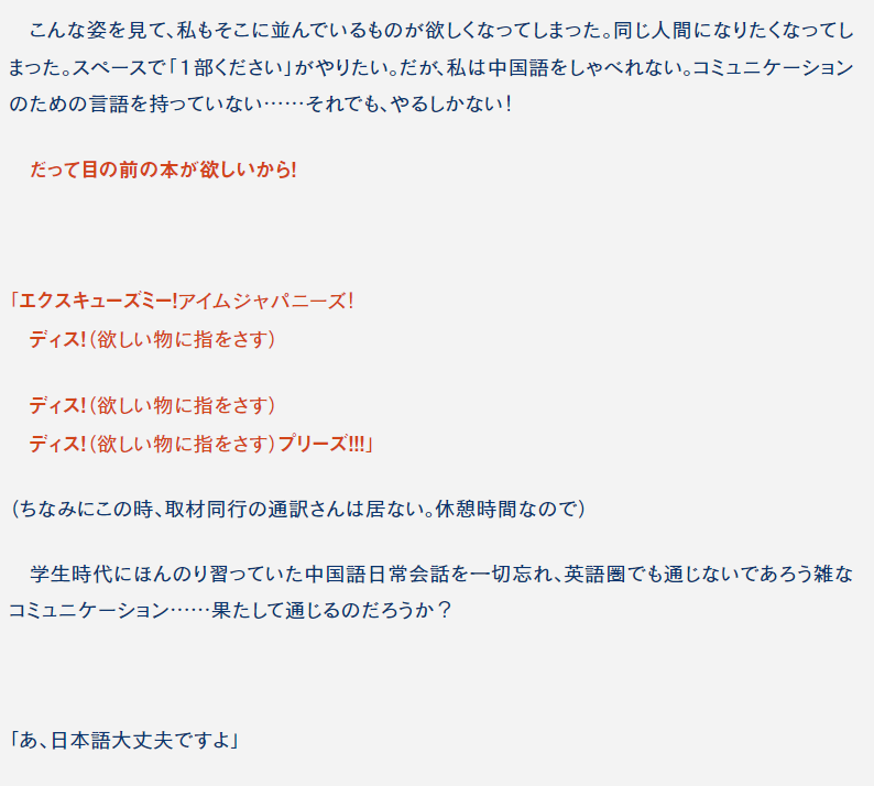 中国での東方人気をこれでもかというほど感じさせてくれる記事でした。何より日本語が通じたというのは衝撃的ですね。自分も海外イベントに行ってみたくなりました。