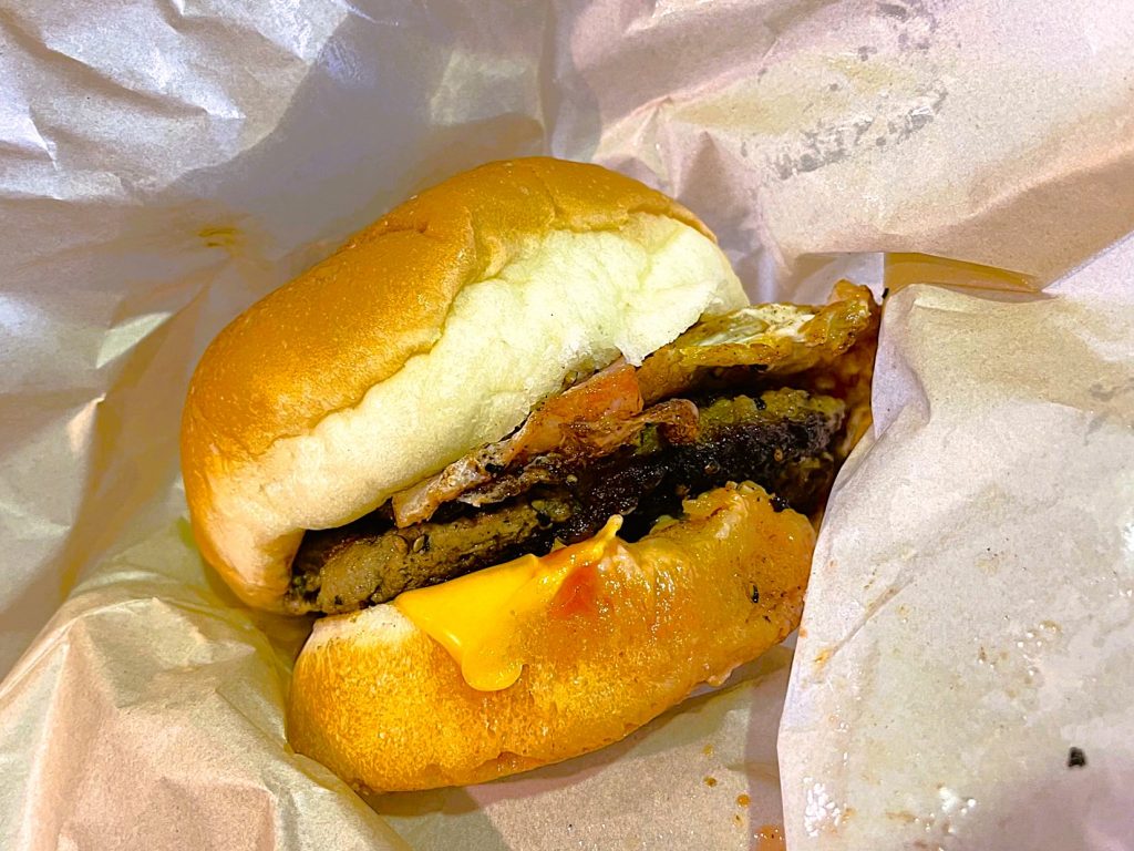 玉子焼き、ベーコン、肉厚のパティ、それが甘辛いソースと混じって食欲が大爆発します。味覚が剛欲異聞(私は贅沢な食べ物・食べ方全般を剛欲異聞と表現します)。