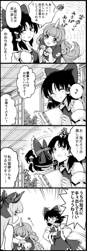 霊夢が大好きなあうんちゃんの4コマです。あうんちゃんは必死ですが、優しい世界を感じること間違い無しです。(カメさん さん)