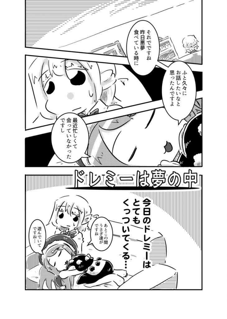 ドレミーの二次創作といったら、やはりドレサグ(サグドレ)です。この二人の二次創作は思うにおよそ数個のパブリックイメージが存在し、本作品はその内の「飄々としたドレミーさんにいじされるサグメさん」の構図が観測されます。日々の勤務、賢者という立場に疲労するクールなサグメをドレミーが夢の中で揶揄い半分(十割かも?)で労ってあげるという物語が繊細かつ柔らかいタッチで描かれています。とにかく尊いのだよ。読め。(天降る⇄⌬ふぁす さん)