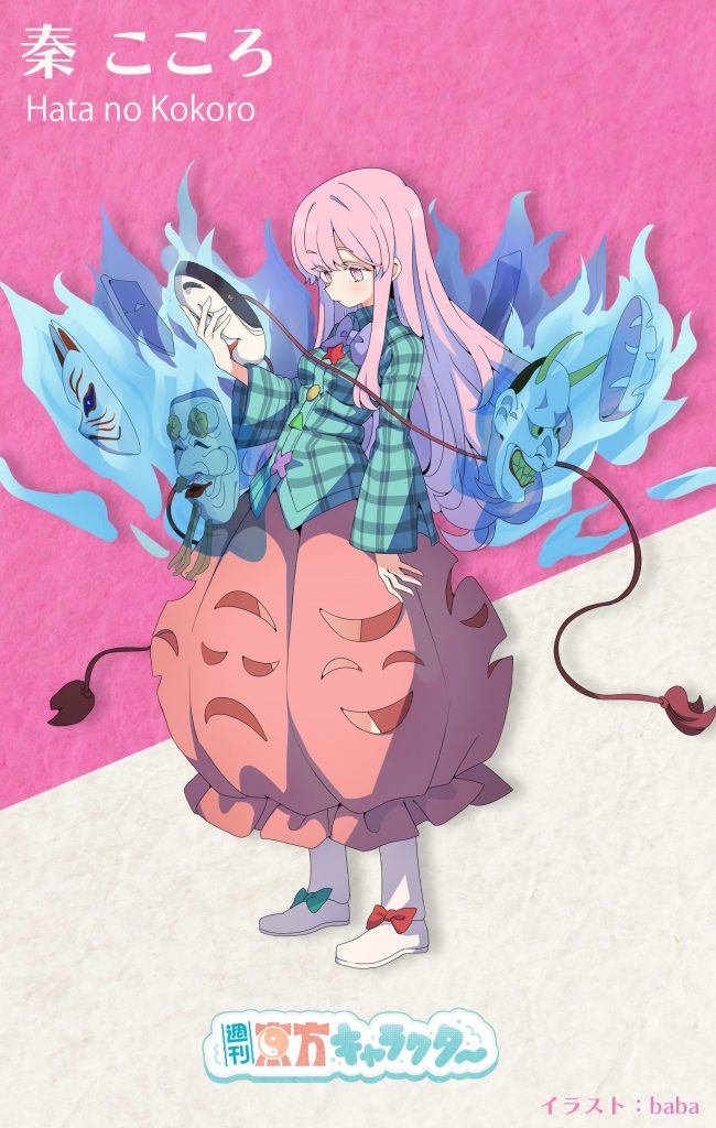 お面の付喪神であるこころ。こころ本人は常に無表情ですが、周囲に浮かぶ複数の能面によって感情を表しています。