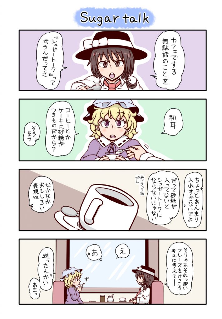 蓮子とメリーが喫茶店でただ他愛のない無駄話を繰り広げる、といった内容の作品なんですが、小難しい用語や言い回しの「らしさ」や、会話のゆる~い空気感が本当に良く…… 2人の日常にありふれた雑談を切り取ったような雰囲気で、読んでいると楽しそうな笑い声が聴こえてくるようです。 同様の作品がもう2冊ありまして、1冊は再録済み、もう1冊は今回の例大祭で頒布されたものなので、ぜひこちらもご覧下さい!(コメツキ さん)
