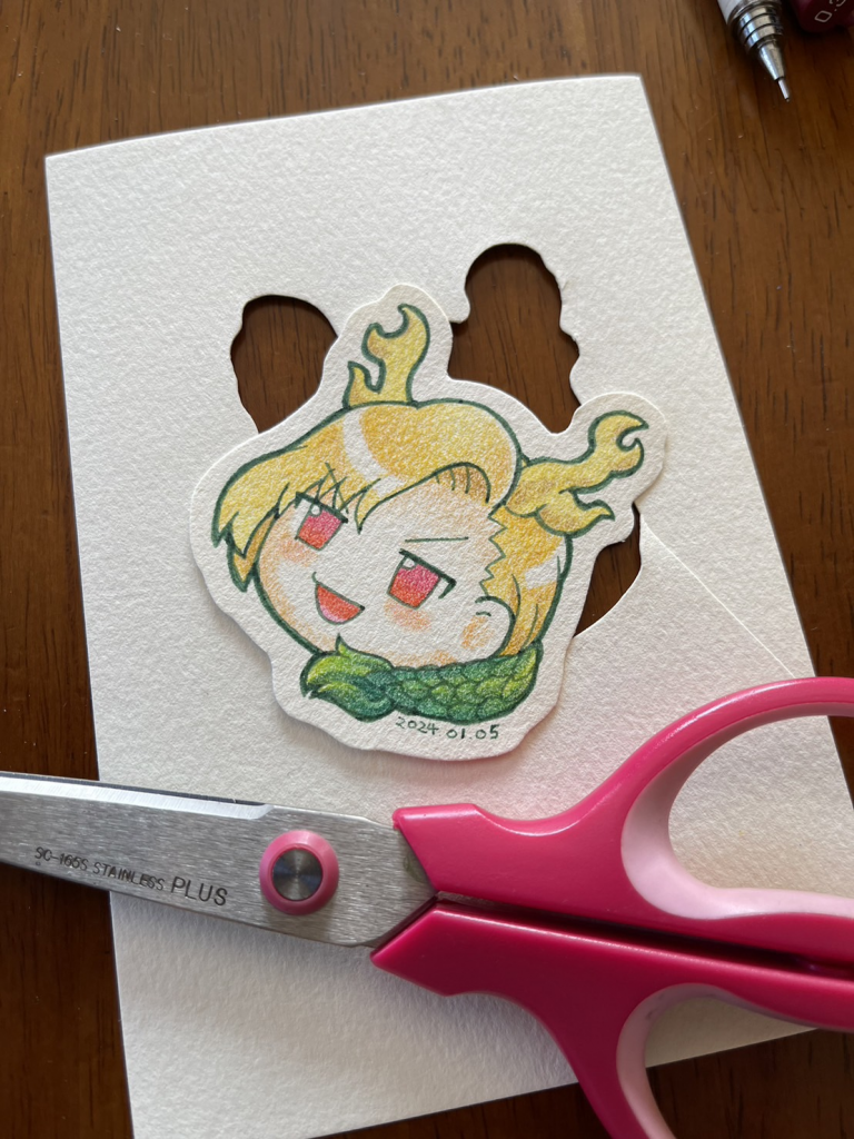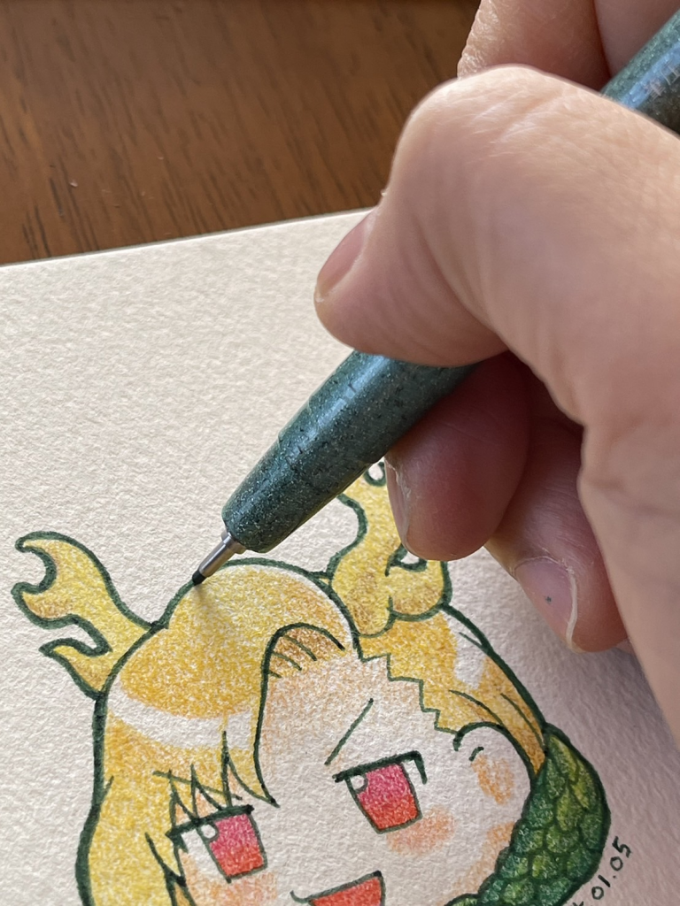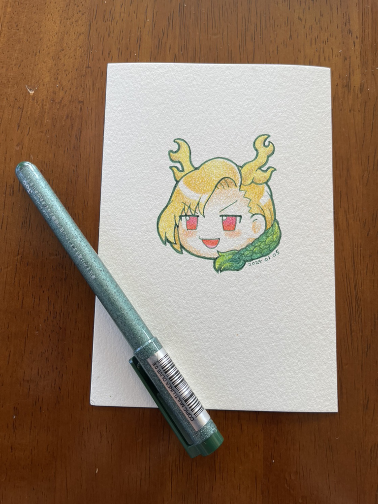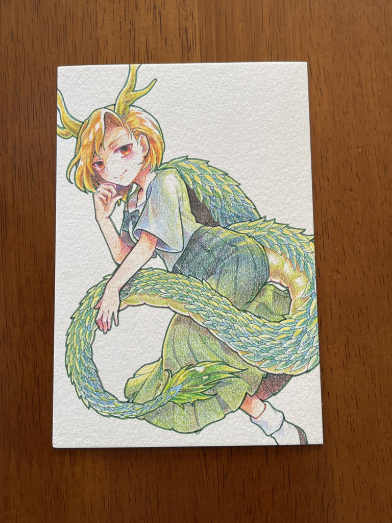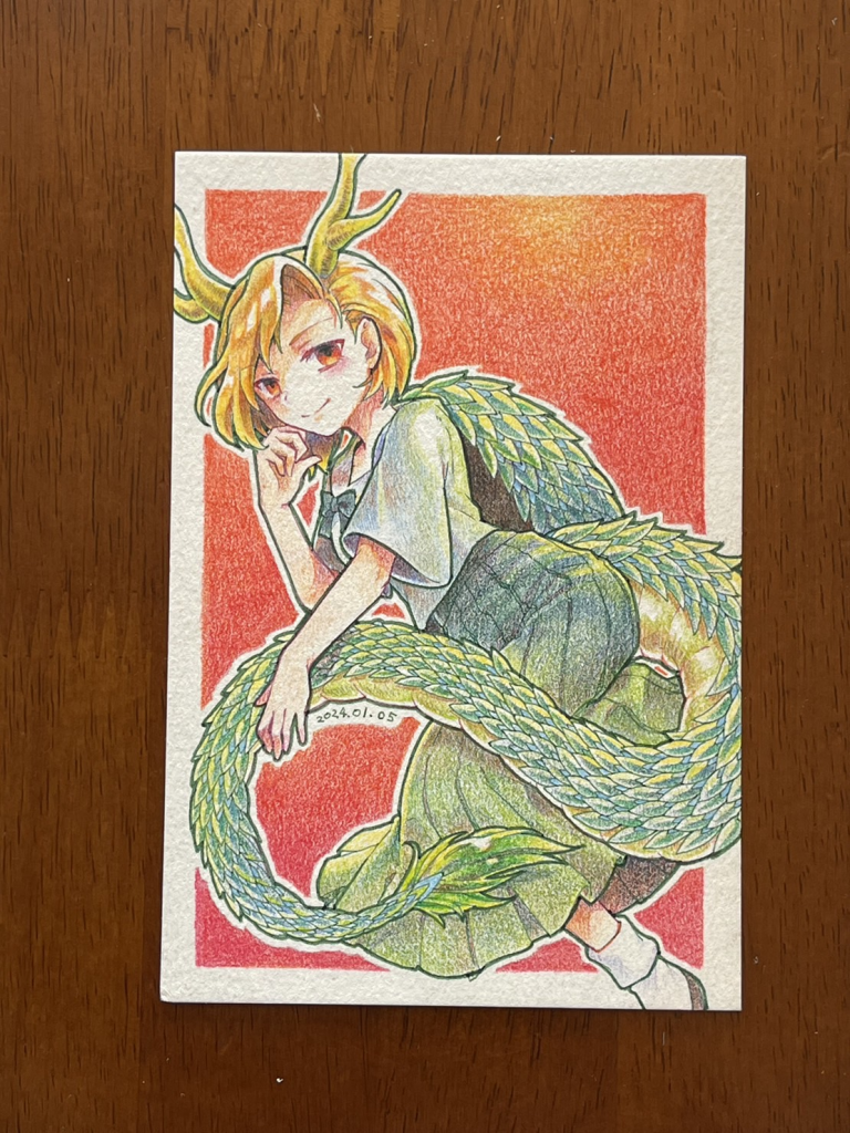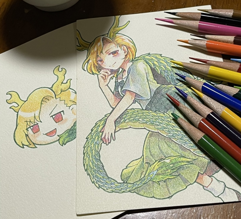 今回はイラストを、はがきサイズの紙に描きました。辰年に、誰でも一度は描いておきたい吉弔八千慧、豪華二本立てです。使用しているのは色鉛筆。小学校で普通に使っているようなもので、まったく特別な色鉛筆じゃないです。