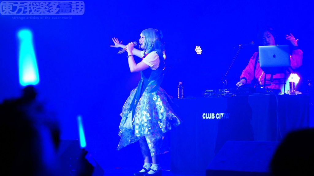 3曲目は、「元祖!天才チルノちゃん」。色とりどりに光り輝く照明と、観客側の青のペンライトが交差して眩しい状態に。ステージ上に立つmikoさんがその光を受け、妖精のように美しくステージを舞います。