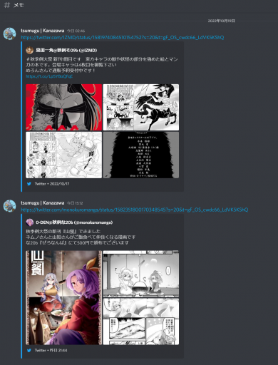 具体的には、Twitterで気になるサークル情報を見かける→ツイートのURLをコピー→Discordの個人用サーバー内に作成したチャンネルへコピーしたURLを貼り付け、といった手順になります。